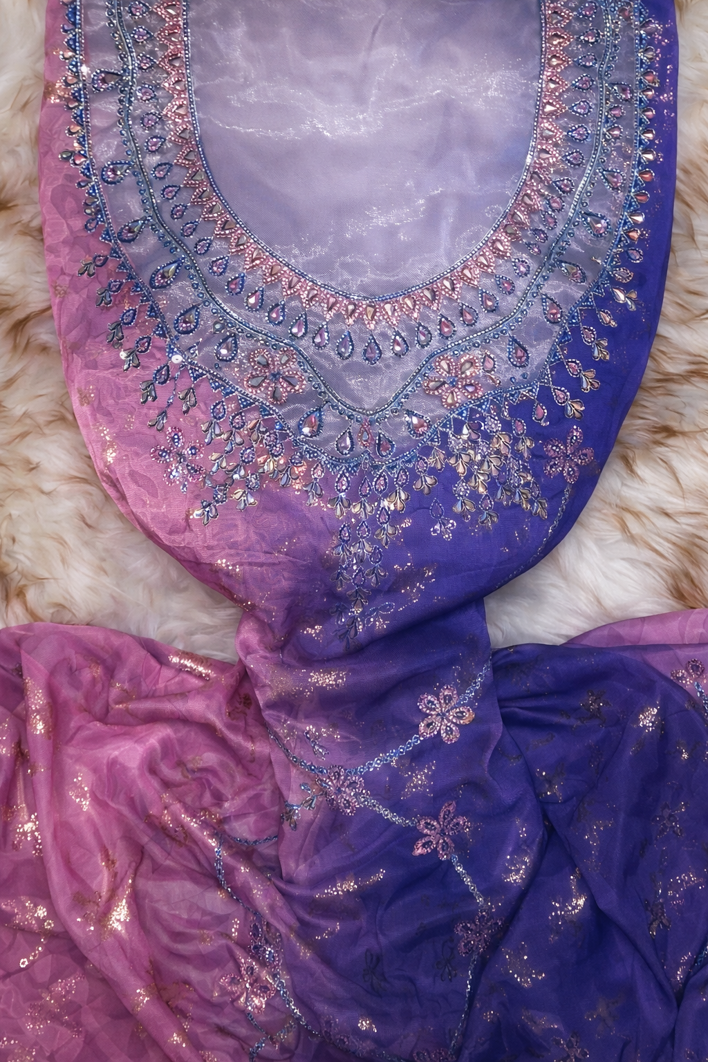 Shine in a look that blends luxury and femininity with this mukhawar crafted from premium Indian ombré silk, featuring soft color gradients that give the design depth and exceptional allure. It is adorned with intricate embroidery that reflects fine craftsmanship, along with crystal accents and six-cut stones that add an elegant, eye-catching sparkle.