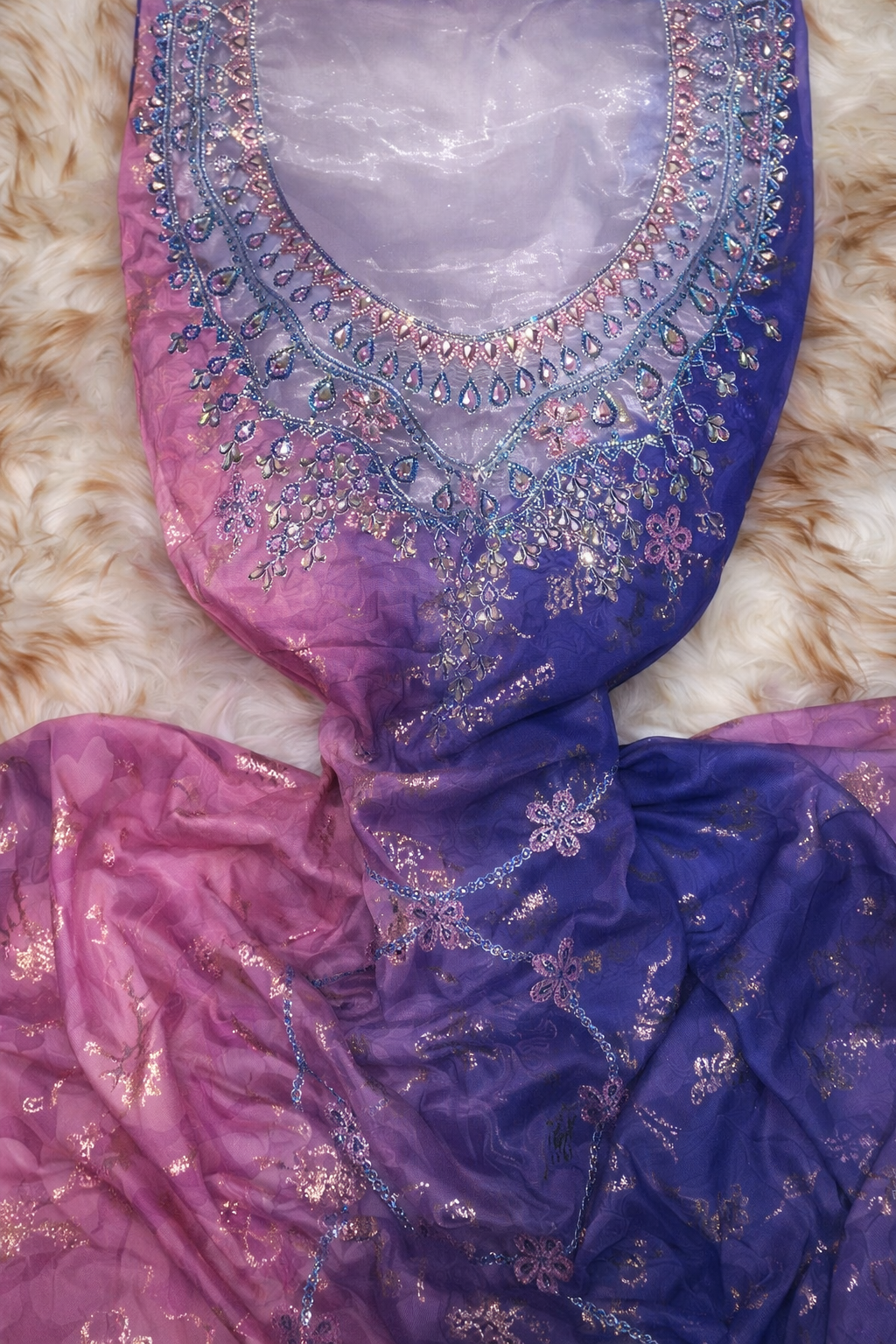 A luxurious ombré Indian silk mukhawar featuring intricate embroidery, crystal embellishments, and complete detailed craftsmanship
