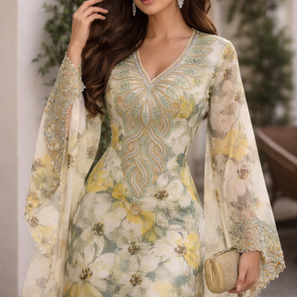 Six-cut stones are delicately scattered to give the piece a captivating sparkle that highlights the beauty of the details, while the fabric flows gracefully to create a luxurious feminine silhouette—perfect for upscale occasions and special evening events. A piece that combines luxury and craftsmanship, making it your ideal choice for every standout appearance.