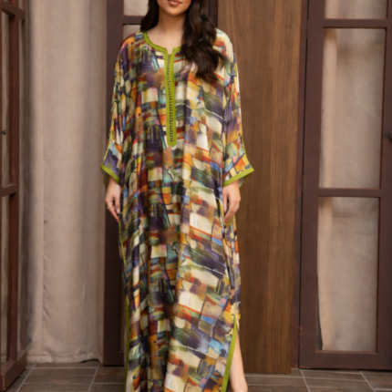جلابية مغربية مصنوعة من حرير أرماني الفاخر، بتصميم واسع ونقشة ناعمة مع لمسات ذهبية راقية، مثالية لإطلالة أنيقة في الاستقبالات والمناسبات الهادئة.
