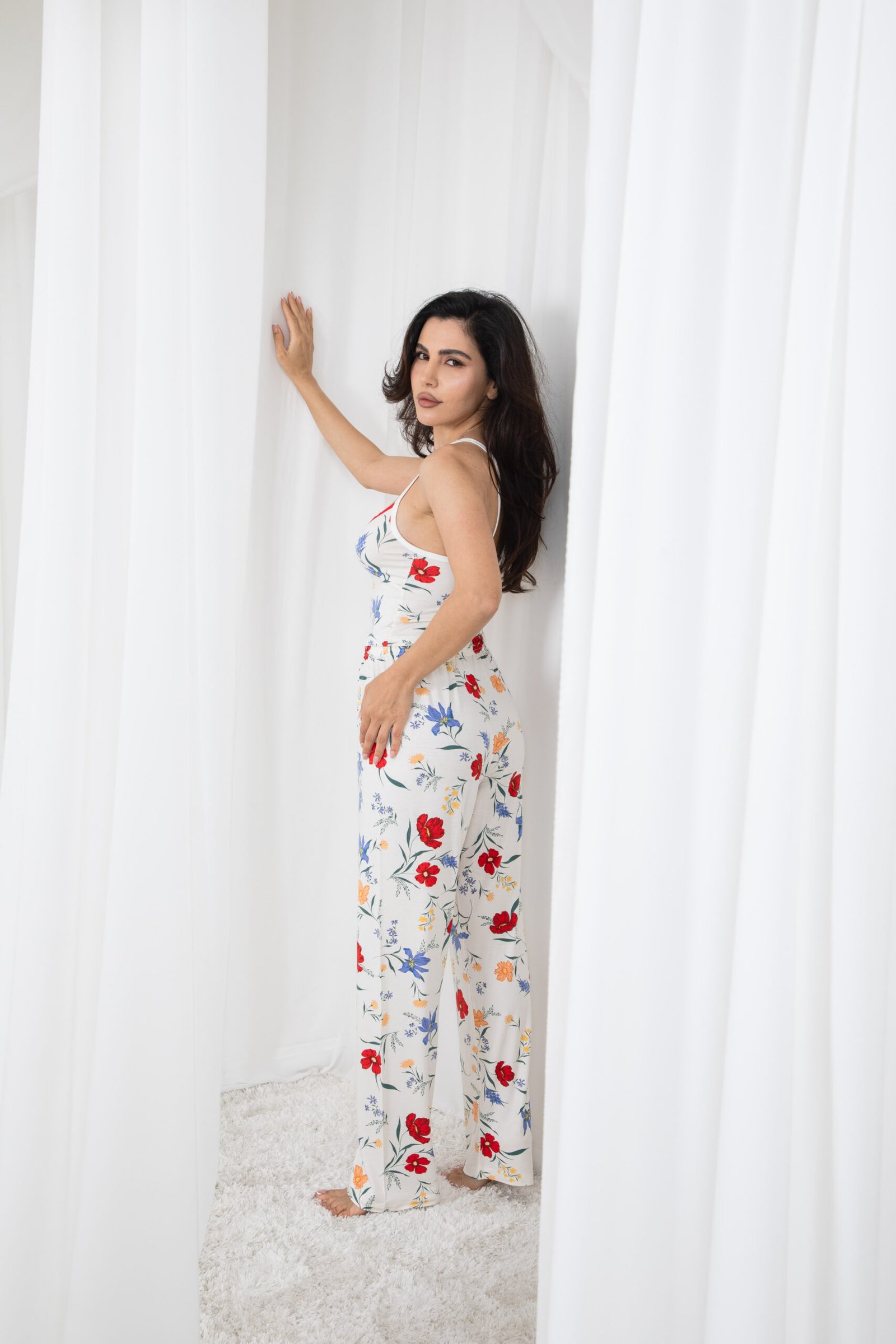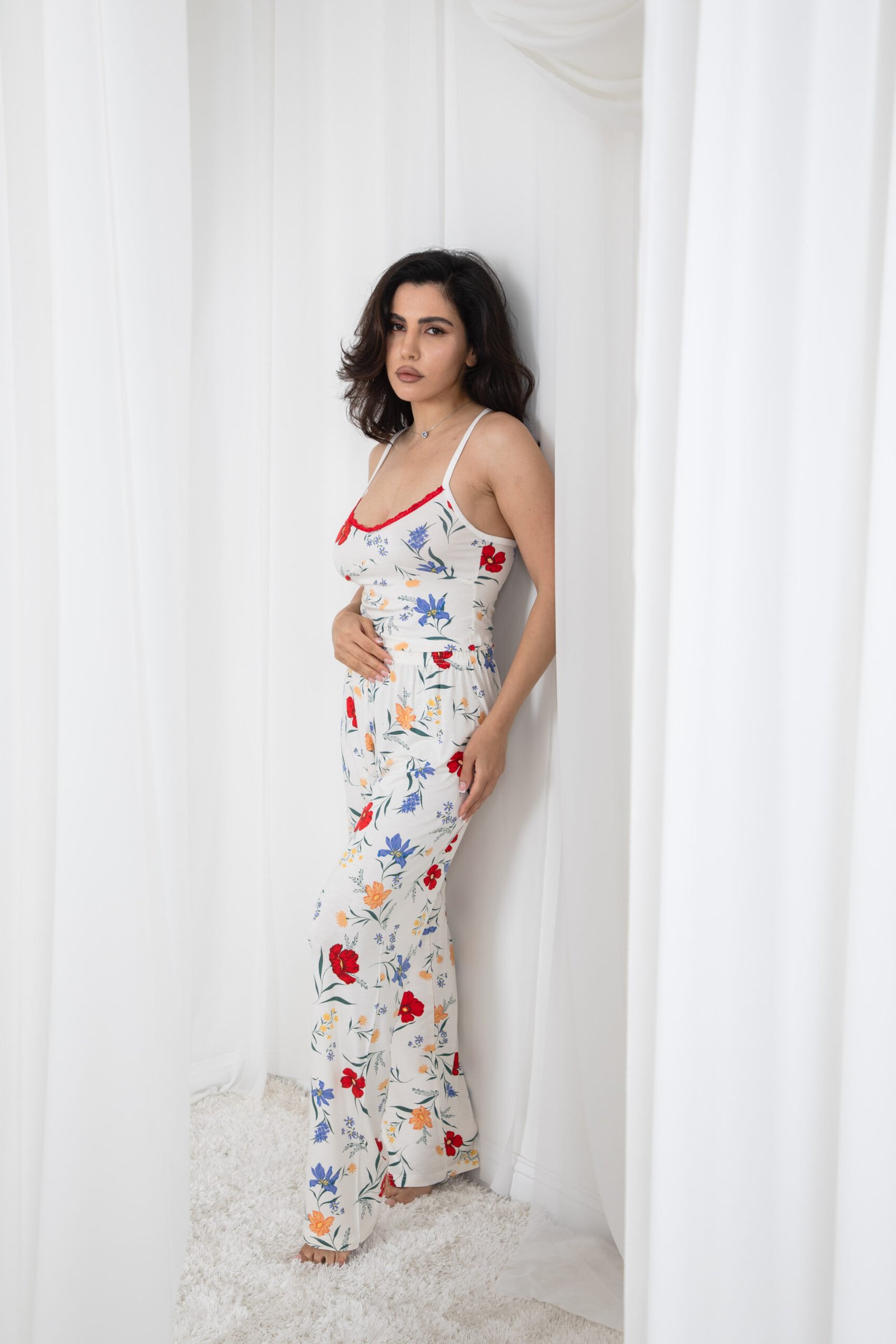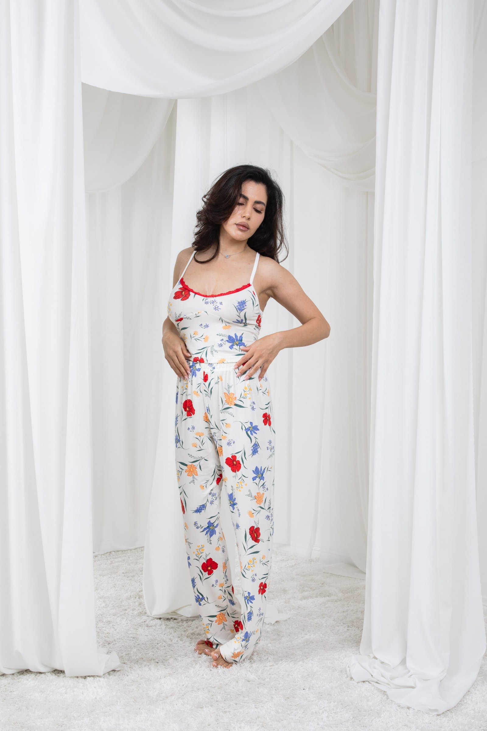بيجامة بيضاء منقوشة بالزهور الملونة