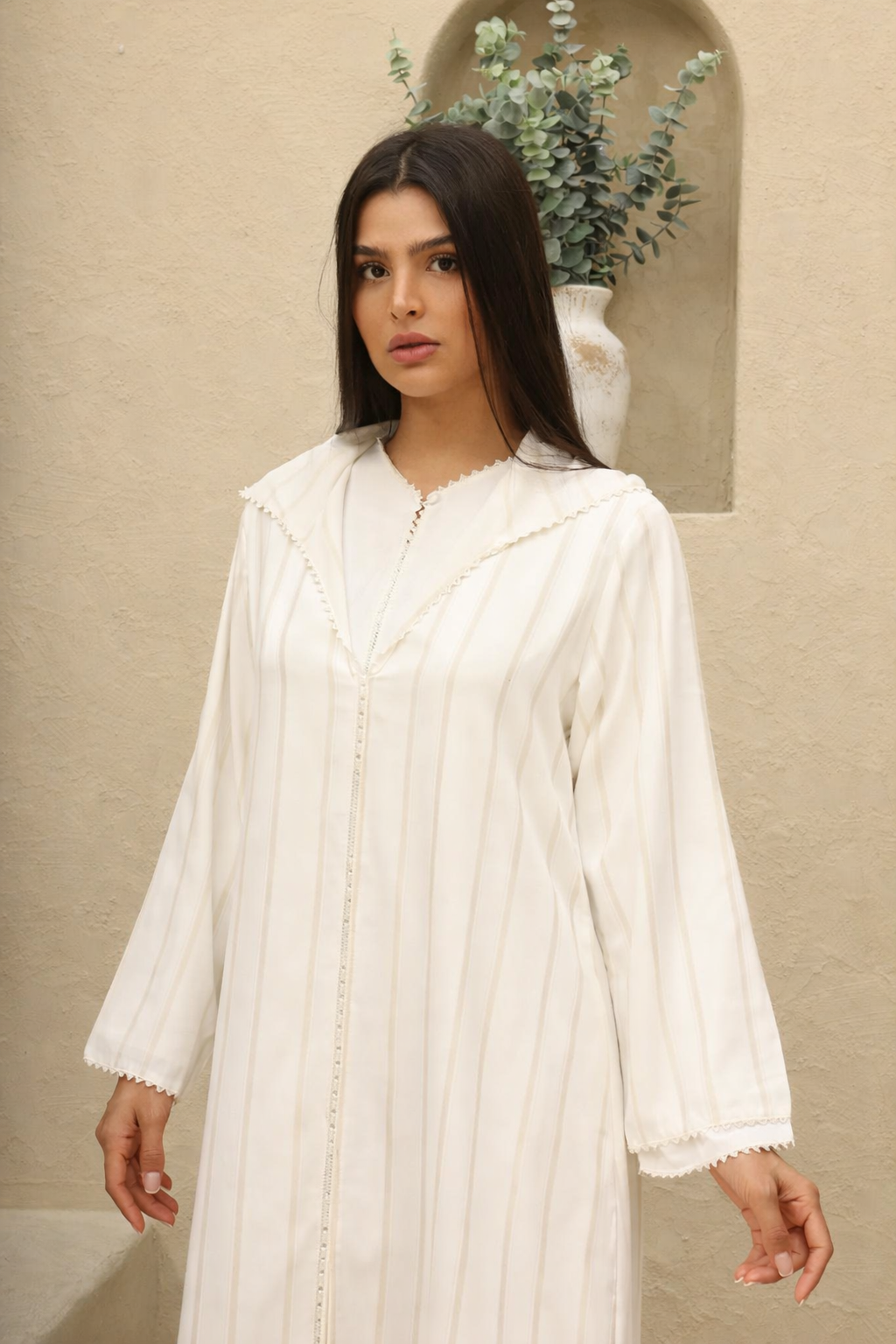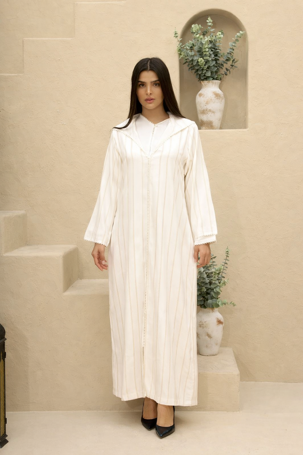 يأتي التصميم بقصة طويلة أنيقة تعزز من جمال القوام وتمنحك حرية الحركة، مع تفاصيل دقيقة تعكس الذوق الرفيع والحرفية العالية. تعد هذه الجلابية خياراً مثالياً للإطلالات اليومية وكذلك للمناسبات، حيث تجمع بين البساطة والرقي في آنٍ واحد.