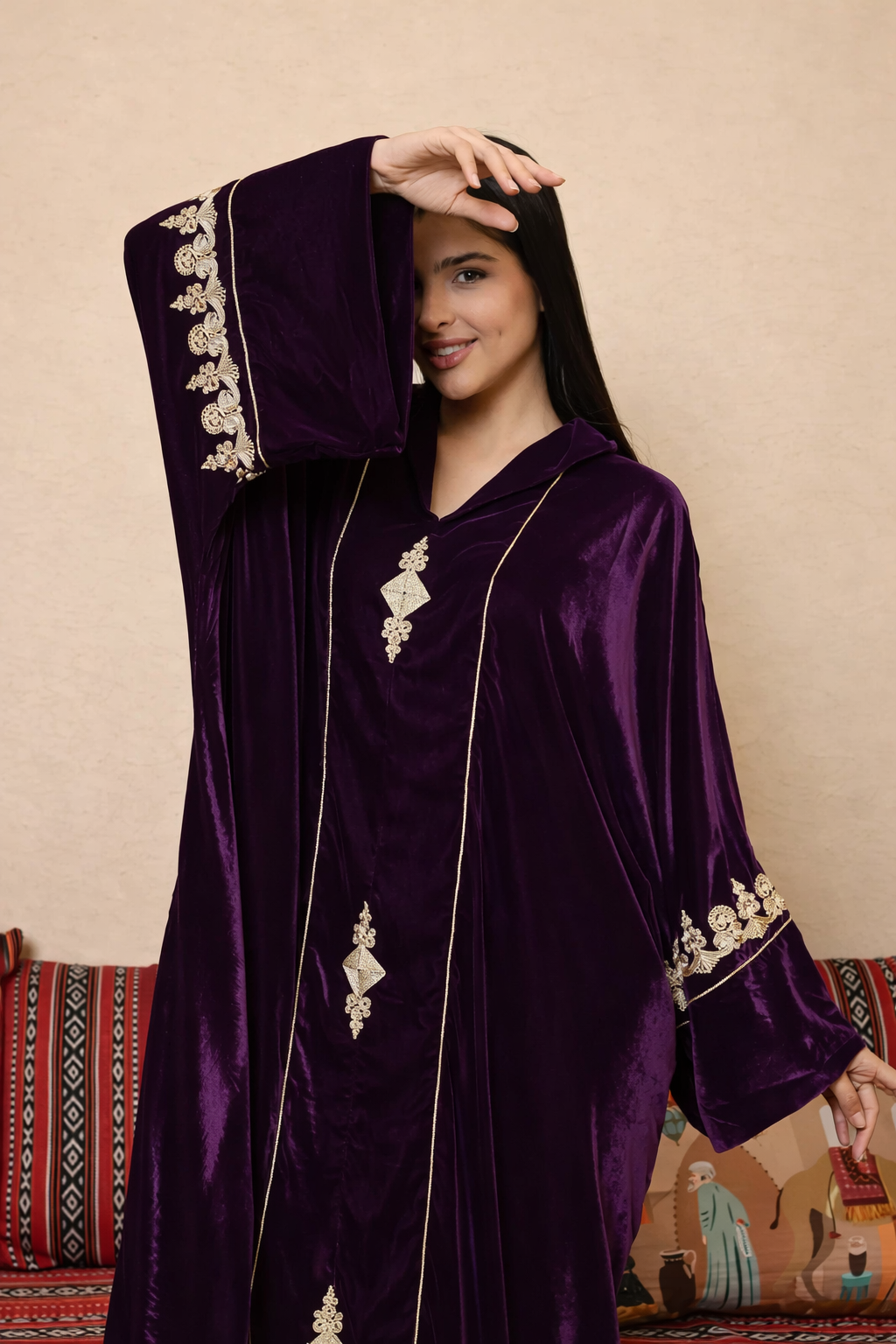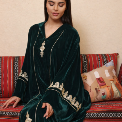 جلابية مغربية من قماش المخمل الناعم بتصميم فاخر وتطريز دقيق، تمنحك إطلالة راقية تجمع بين الأصالة والأناقة، مثالية للمناسبات والظهور المميز.
