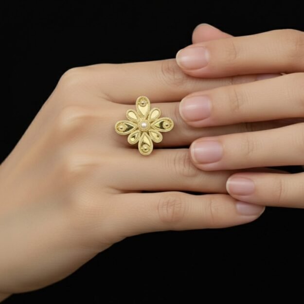 خاتم ذهبي بتصميم زهرة أنيقة مع حجر لؤلؤي