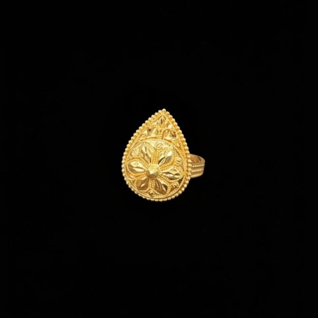 خاتم أنيق باللون الذهبي بتصميم على شكل قطرة مزخرفة بتفاصيل دقيقة، يمنح إطلالتك لمسة فخامة وأناقة تناسب مختلف المناسبات.