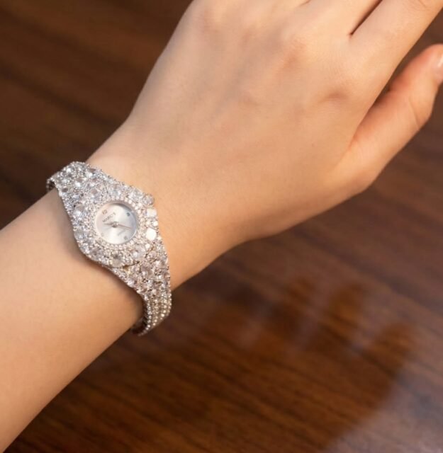 يتميز سوار الساعة بتصميم فاخر مرصع بالكامل بالكريستال، مما يمنحها مظهراً يشبه الأساور الراقية ويجعلها قطعة مجوهرات مميزة وليست مجرد ساعة تقليدية. تصميمها المتناسق يجعلها مناسبة للمناسبات الخاصة والسهرات وكذلك للإطلالات اليومية الأنيقة.