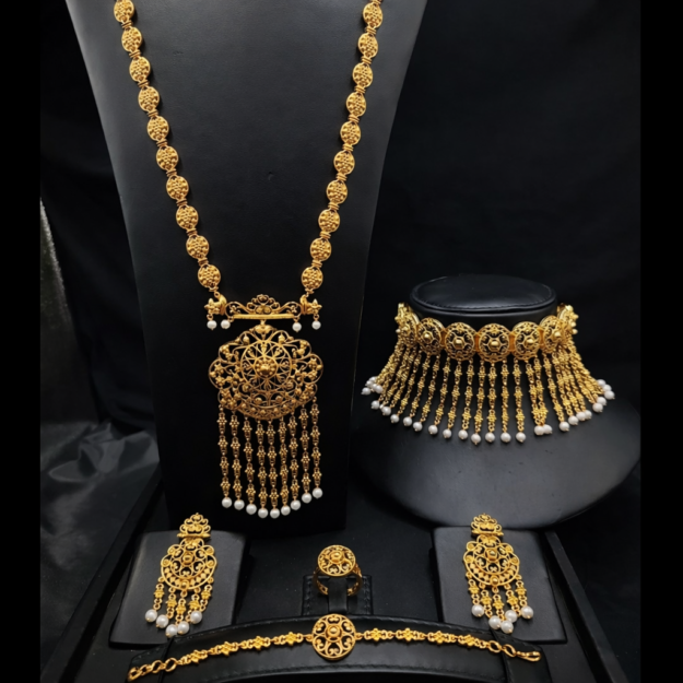 طقم إكسسوارات نسائي فاخر يتكون من عقد طويل مع تعليقة مزخرفة وشوكر أنيق مع أقراط وخاتم وسوار متناسق. تصميم تراثي باللون الذهبي مع تفاصيل لؤلؤية يمنحك إطلالة فخمة للمناسبات والأعراس.