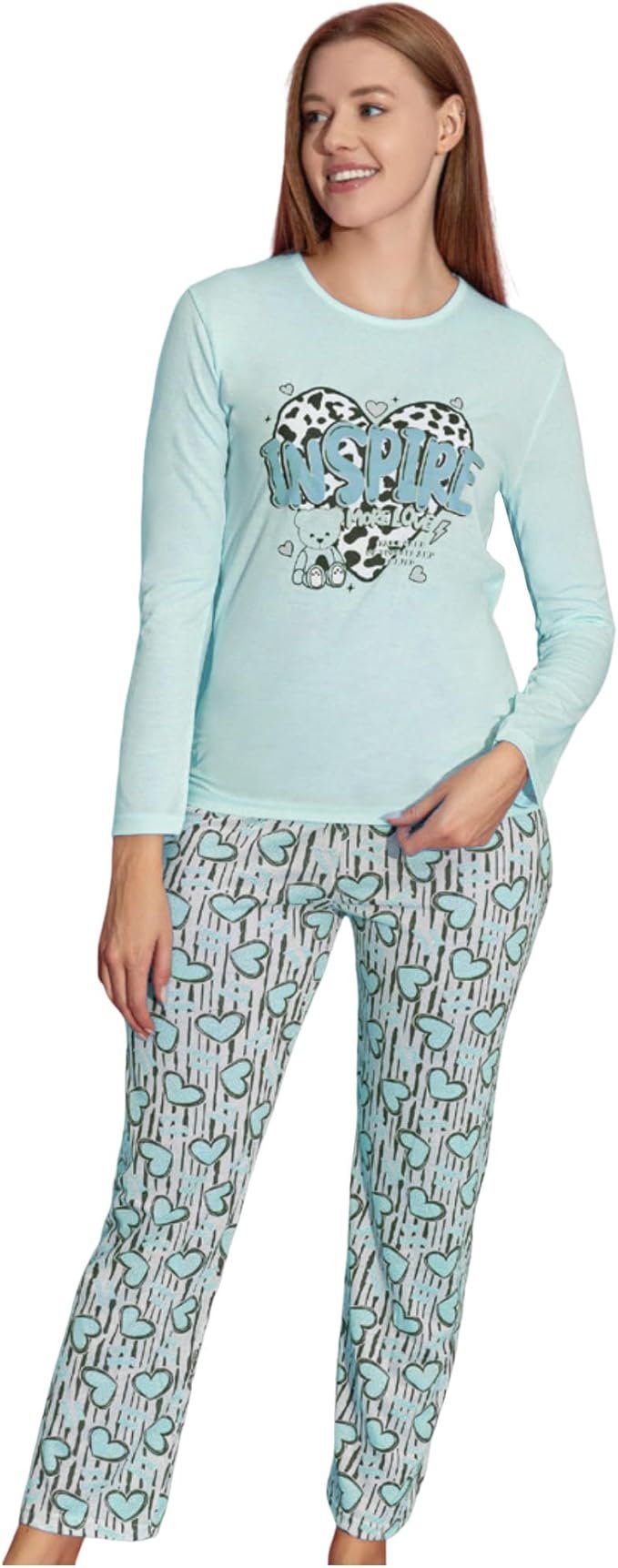 طقم بيجامة للنساء مكون من قطعتين بطباعة قلب
