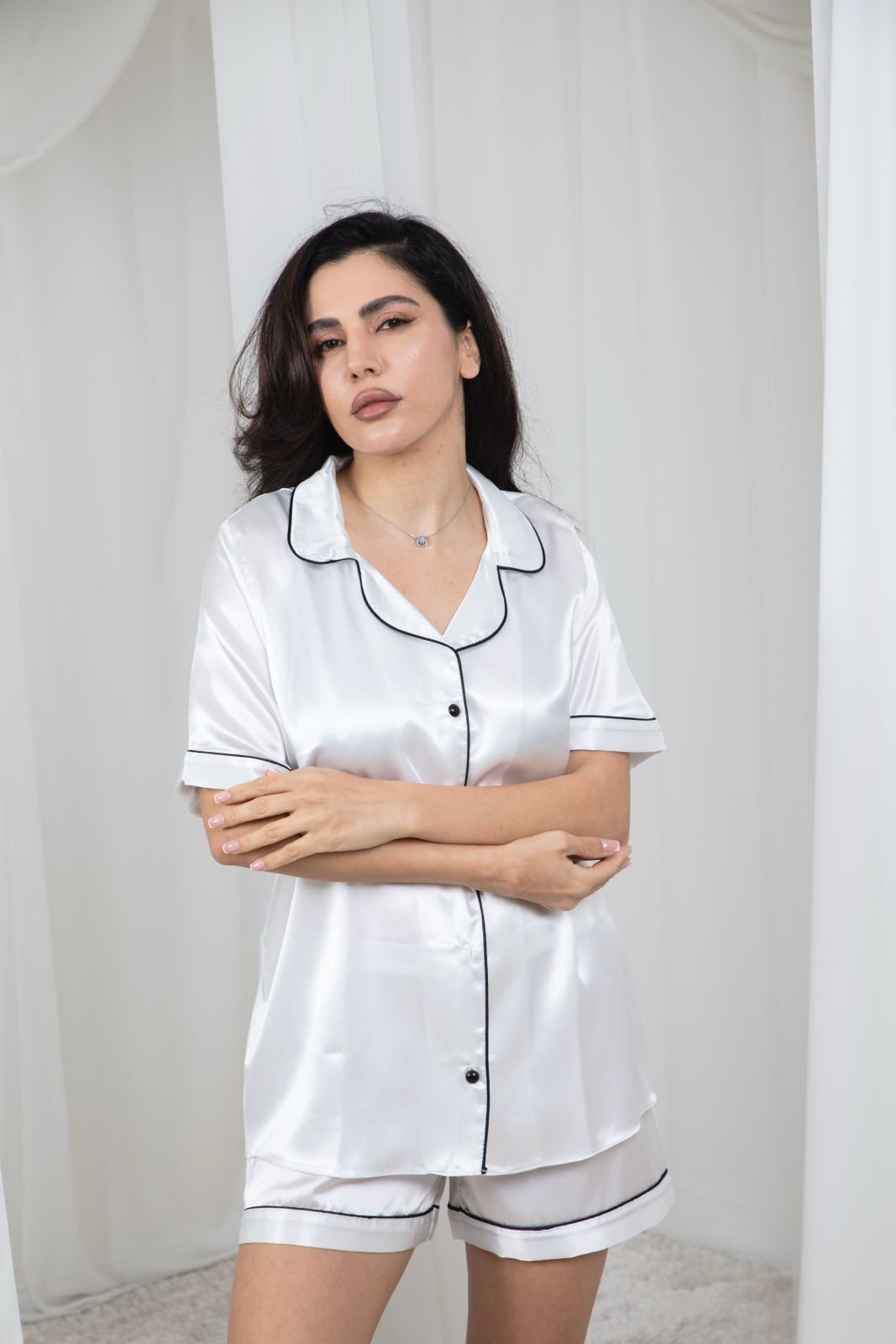 بيجامة نوم نسائي قصير من الساتان الفاخر بتصميم كلاسيكي مريح