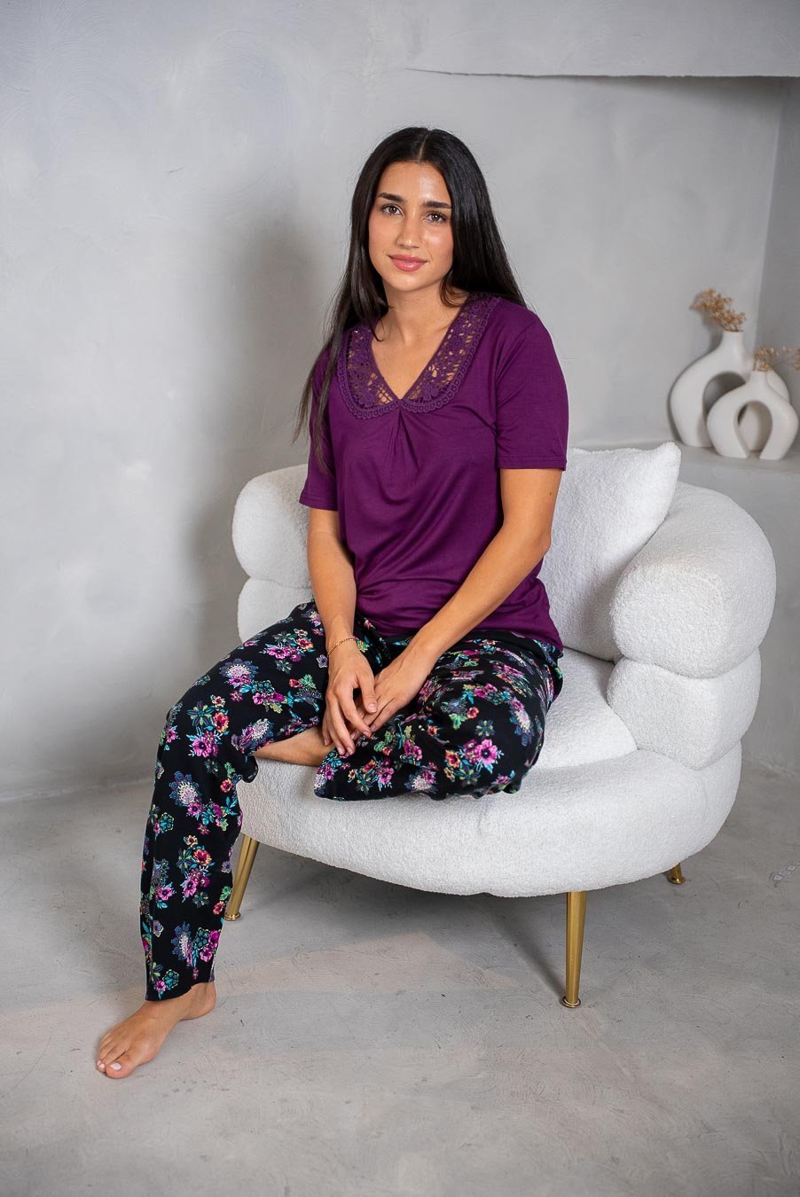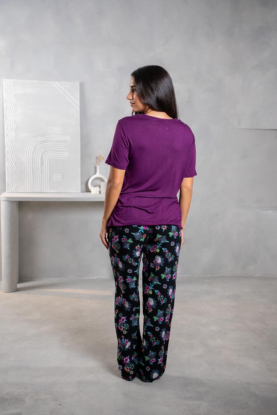 طقم بيجاما أنيق يتضمن بلوزة ناعمة ذات لون موحد مع بنطلون واسع الساق مطبوع باللون البنفسجي ومزين بنقشة دقيقة تغطيه بالكامل. مثالي لإطلالة نوم لطيفة ومريحة. الخامة:٩٥٪فيسكوز ٥٪ليكرا