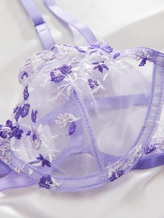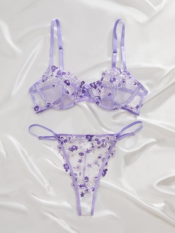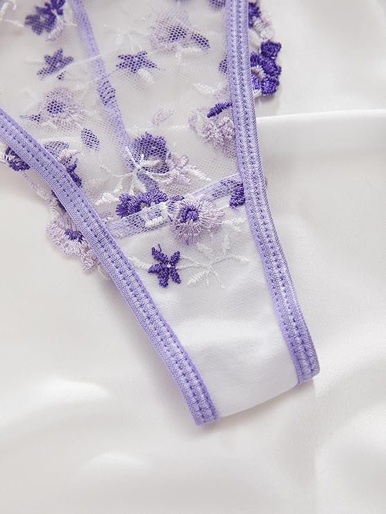 - التفاصيل: مطرز، شفاف، يتميز برقبة على شكل حرف V ورباط مجوف مزين بالزهور، تصميم مثير، طقم ملابس داخلية مكون من قطعتين