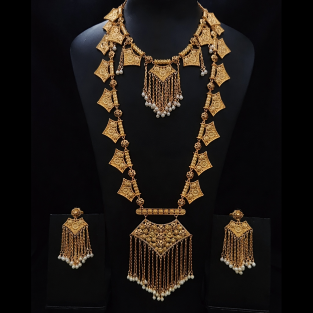 طقم عقد وأقراط ذهبي فاخر بتصميم تراثي مع لؤلؤ للنساء