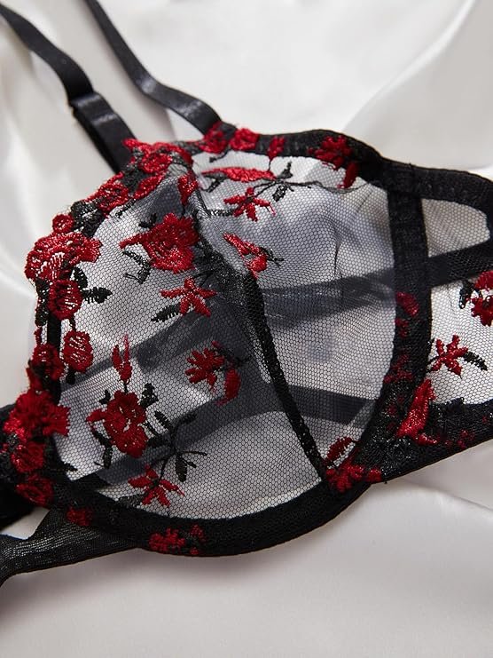 - التفاصيل: مطرز، شفاف، يتميز برقبة على شكل حرف V ورباط مجوف مزين بالزهور، تصميم مثير، طقم ملابس داخلية مكون من قطعتين