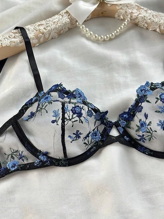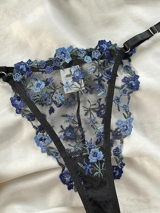- التفاصيل: مطرز، شفاف، يتميز برقبة على شكل حرف V ورباط مجوف مزين بالزهور، تصميم مثير، طقم ملابس داخلية مكون من قطعتين