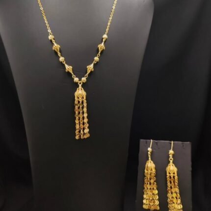 يتميز هذا الطقم الذهبي بتصميمه الأنيق الذي يجمع بين البساطة والفخامة في تفاصيله الدقيقة. يتكون الطقم من عقد طويل بسلسلة ذهبية ناعمة مزينة بعناصر زخرفية على الجانبين، تنتهي بتعليقة أنيقة تتدلى منها سلاسل صغيرة مع كرات ذهبية تضيف حركة جذابة ولمسة أنثوية مميزة عند الارتداء.