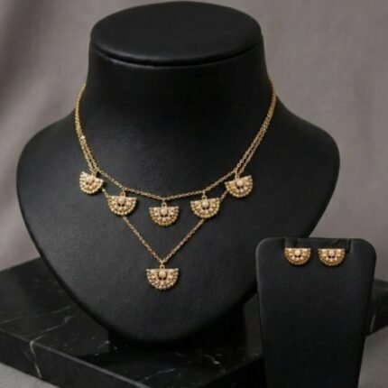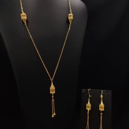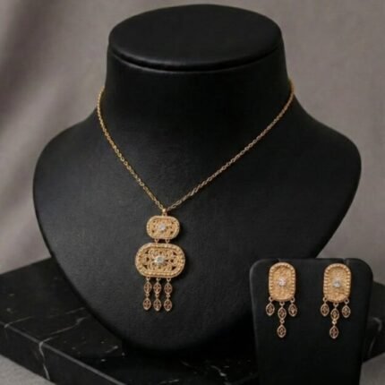 طقم مجوهرات ذهبي أنيق يتكون من عقد وأقراط بتصميم متدلي مزخرف يمنحك إطلالة فاخرة ومميزة للمناسبات.