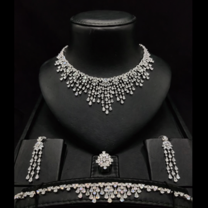 طقم مجوهرات أنيق باللون الفضي مرصع بالكريستال اللامع، يتكون من عقد فاخر مع أقراط وسوار وخاتم متناسق، مثالي للمناسبات والسهرات.