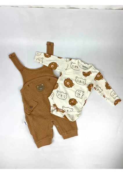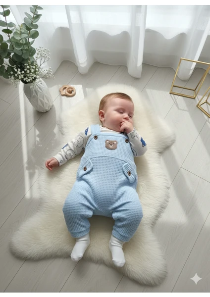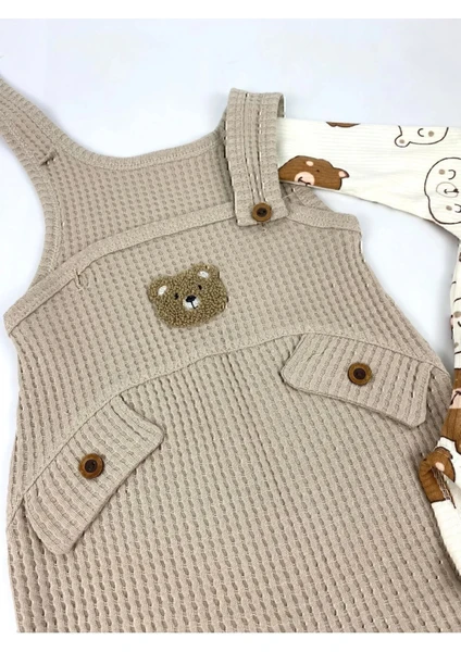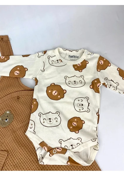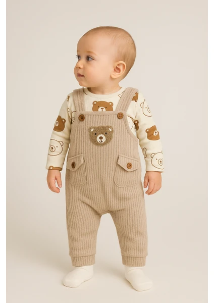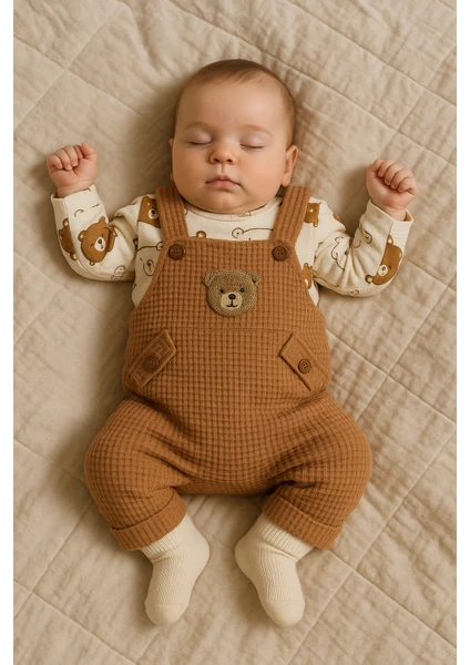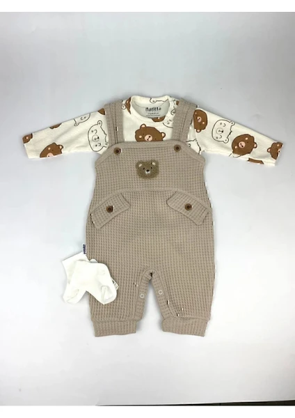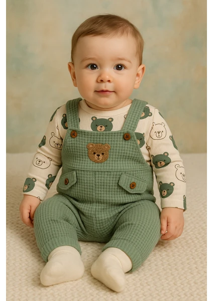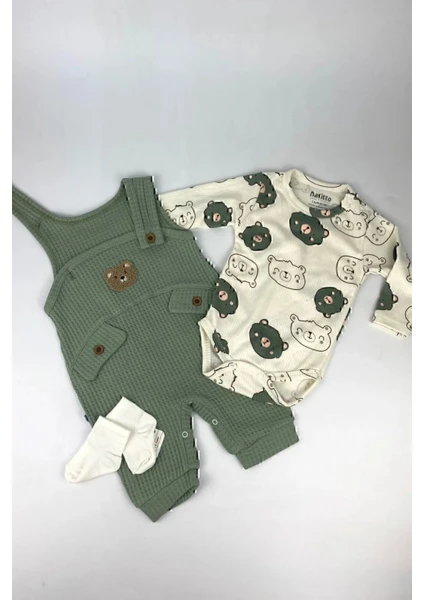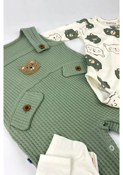طقم ملابس أولاد للرضّع مكوّن من 3 قطع: بودي داخلي، سالوبيت، وجوارب، مزين بتطريز دب، مناسب لعمر 3–6–9-12 أشهر، مصنوع من قطن 100% عضوي، مريح وناعم على بشرة الطفل.