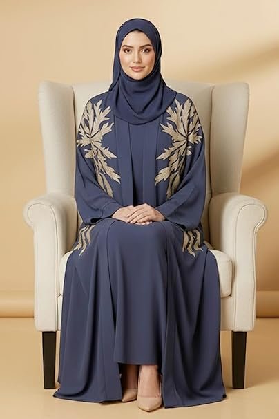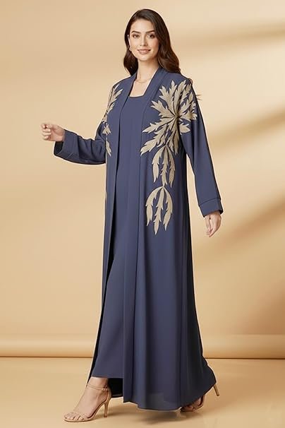 عباية اسلامية مفتوحة من الداخل مزينة باوراق شجر ذهبية مطرزة باكمام طويلة للنساء من قطعتين بلون كحلي