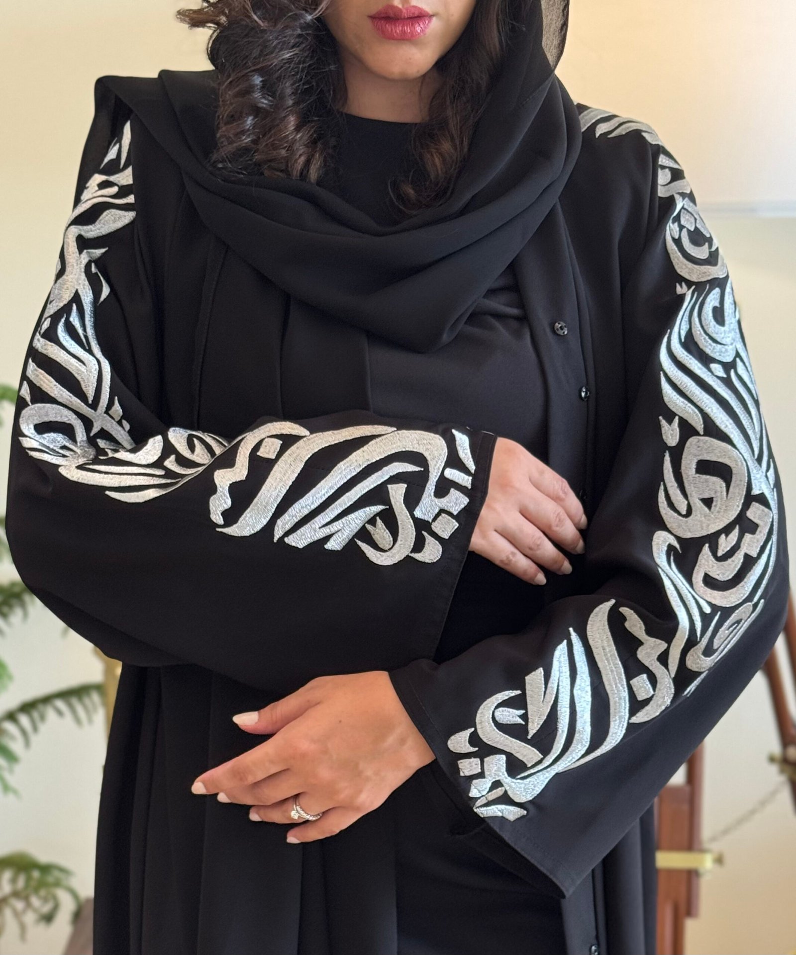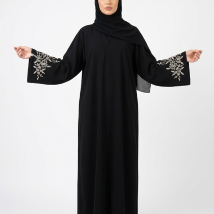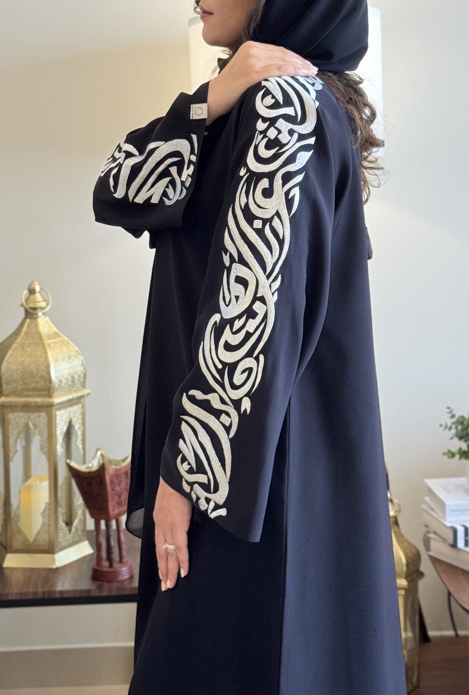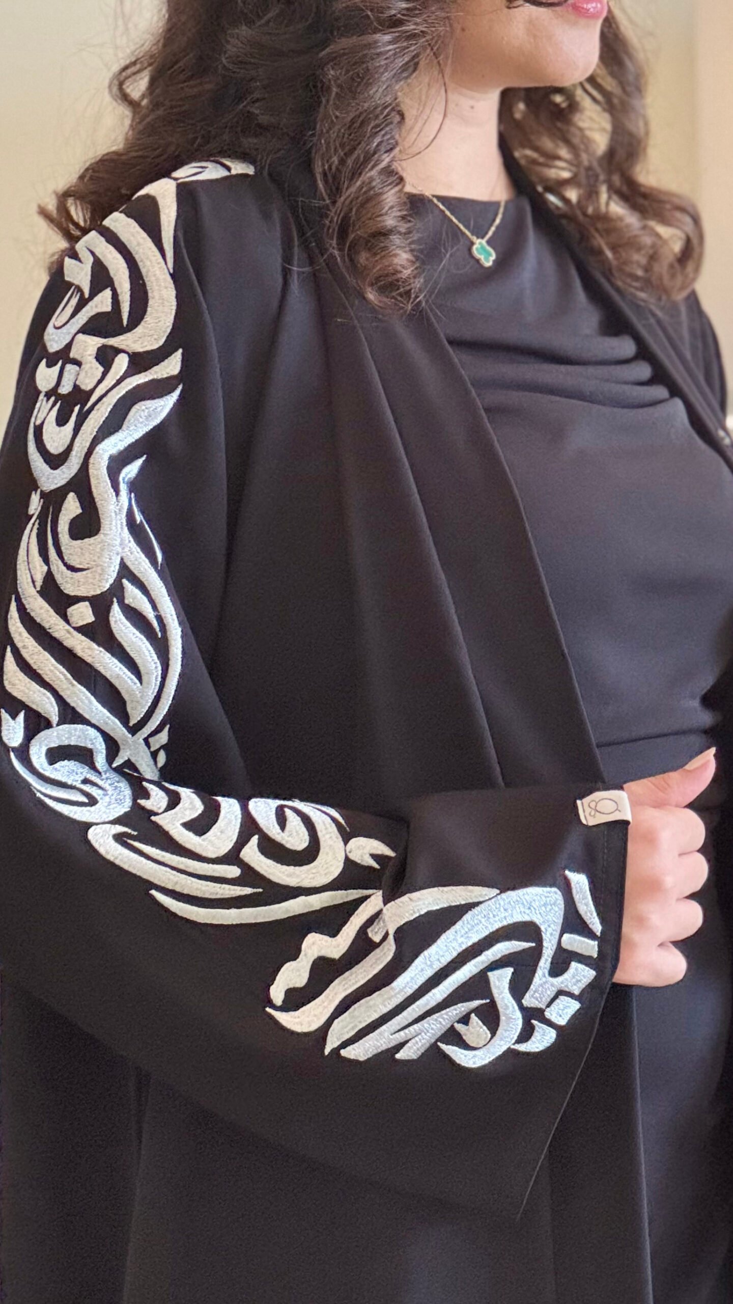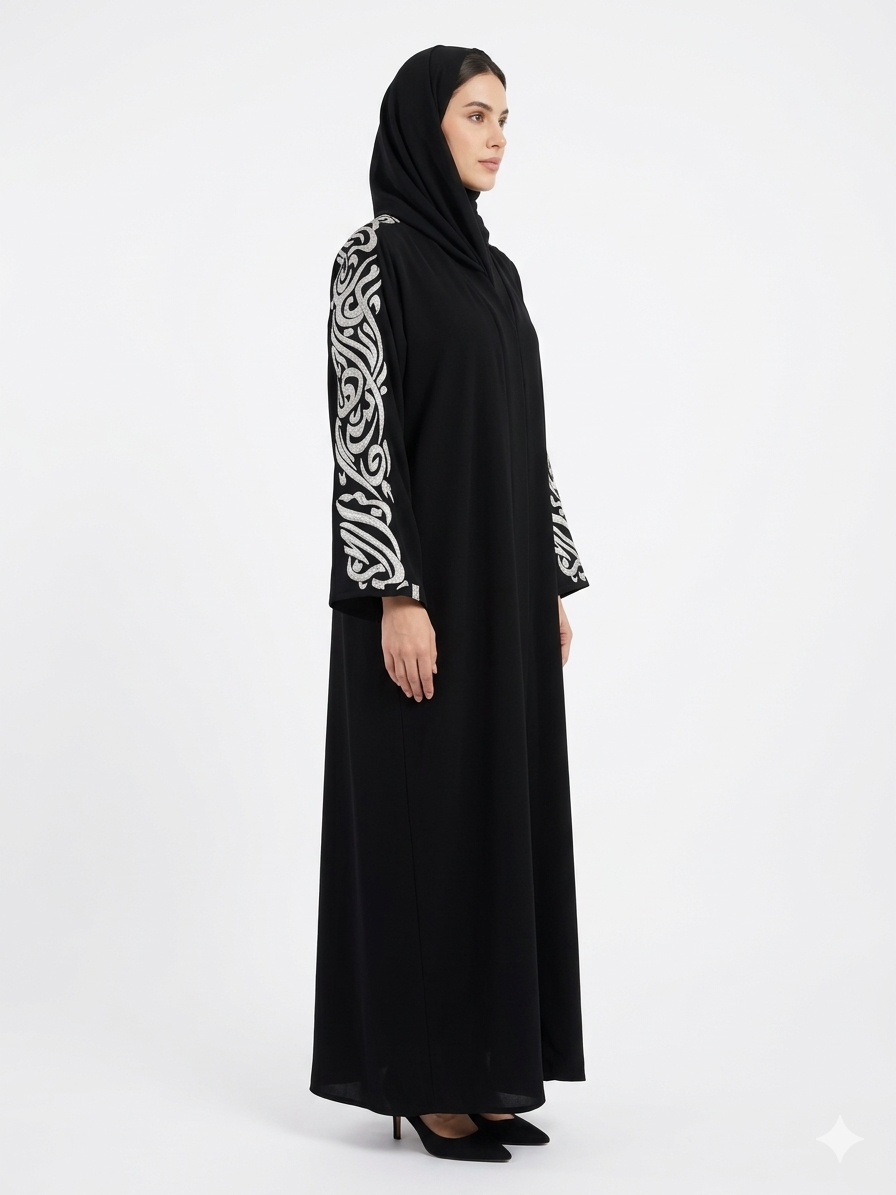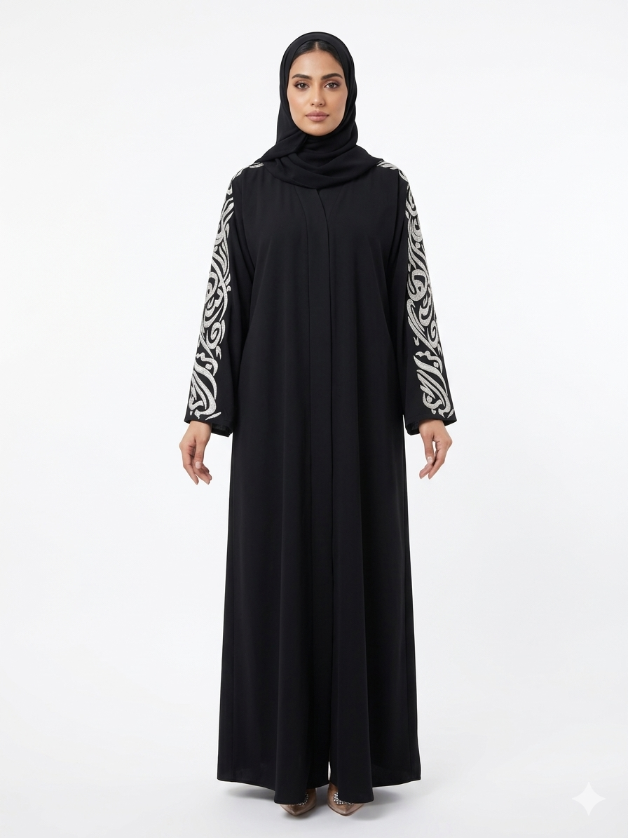 ما يميز هذه القطعة هو التطريز المتقن الذي يغطي كامل الأكمام، المستوحى من الخطوط العربية بأسلوب فني راقٍ، ليمنح العباية حضوراً مميزاً يجمع بين البساطة والفخامة. تتوسط هذا الجمال عبارة خاصة على الكم: