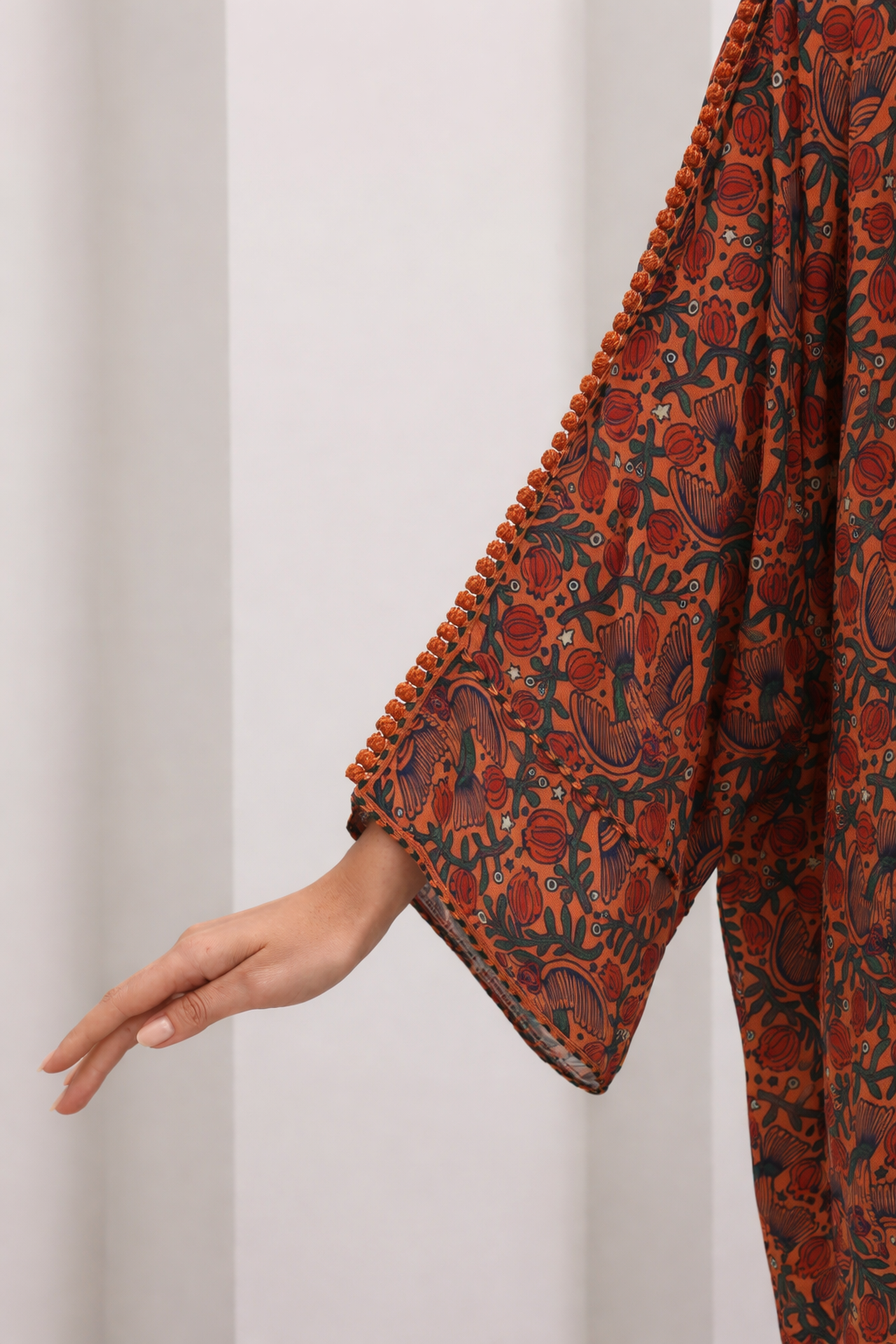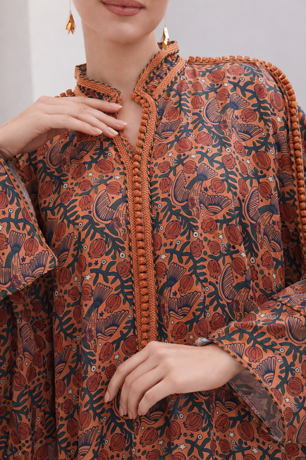 استمتعي بإطلالة تنبض بالرقي مع هذا القفطان المصمم بأسلوب يجمع بين الفخامة والبساطة في آنٍ واحد. يتميّز بنقوش راقية تضفي عمقاً جمالياً لافتاً، مع ياقة أنيقة وتفاصيل مشغولة بعناية على منطقة الصدر والأطراف تعكس دقة الحرفية وجودة التنفيذ.