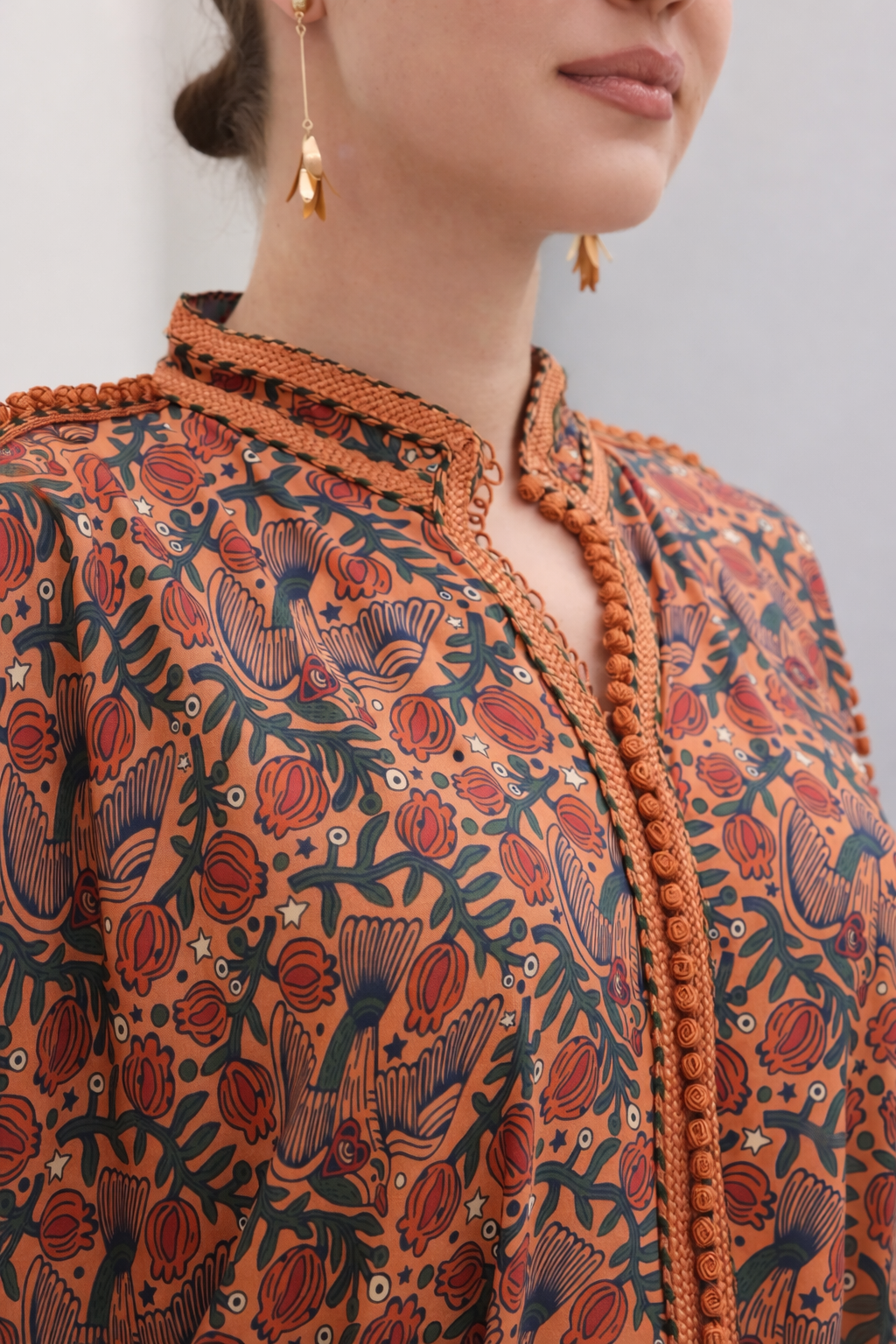 قفطان أنيق يجمع بين النقوش الراقية والتفاصيل المتقنة، بياقة مميزة وقصة انسيابية تمنحك حضوراً ناعماً وفخماً. مصنوع يدوياً بجودة عالية.