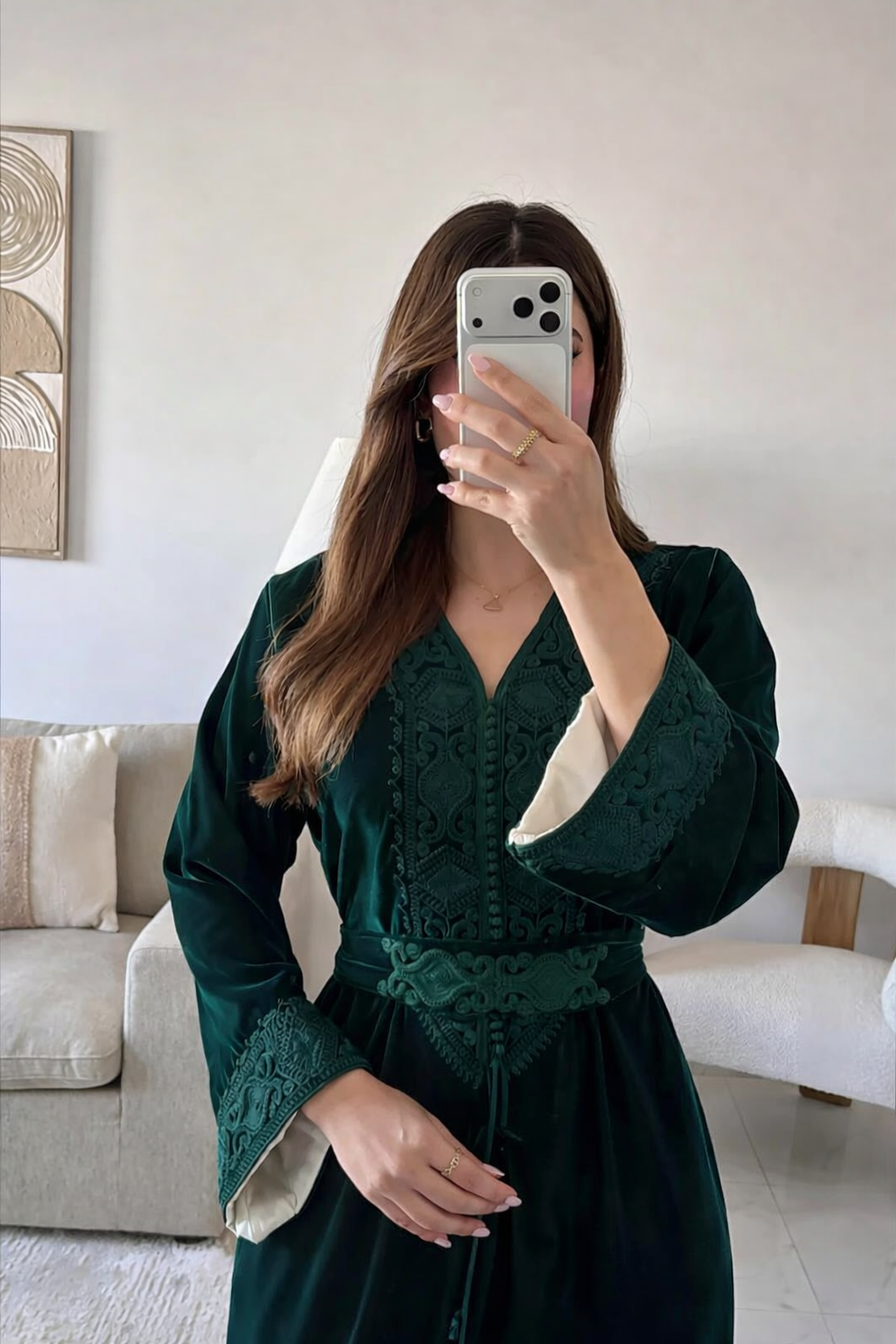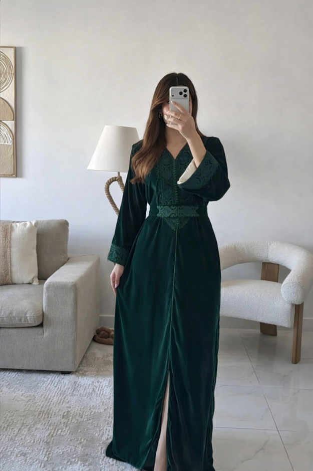 قفطان مخملي أنيق بتصميم راقٍ، يتميز بياقة V وأكمام واسعة مطرزة مع حزام خصر يبرز القوام، مثالي للمناسبات الراقية.