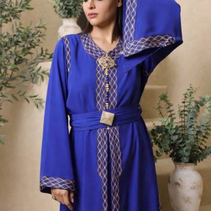 تألقي بإطلالة ملكية مع هذا القفطان التقليدي الذي يجمع بين الفخامة والطابع العصري. يتميز بلون أزرق ملكي مع تطريزات ذهبية أنيقة تضفي لمسة راقية مثالية للمناسبات الخاصة. تصميم بياقة على شكل V وأكمام طويلة يمنح مظهراً محتشماً وأنيقاً، مع حزام ذهبي يحدد الخصر ليبرز القوام بأسلوب جذاب. قماش فاخر وانسيابي بطول أرضي مع أزرار أمامية بلمسات معدنية، ليكون الخيار الأمثل للاحتفالات والمناسبات الرسمية