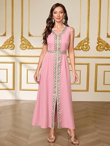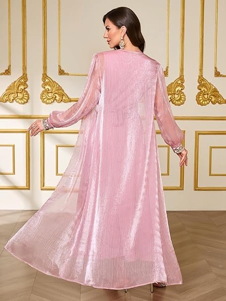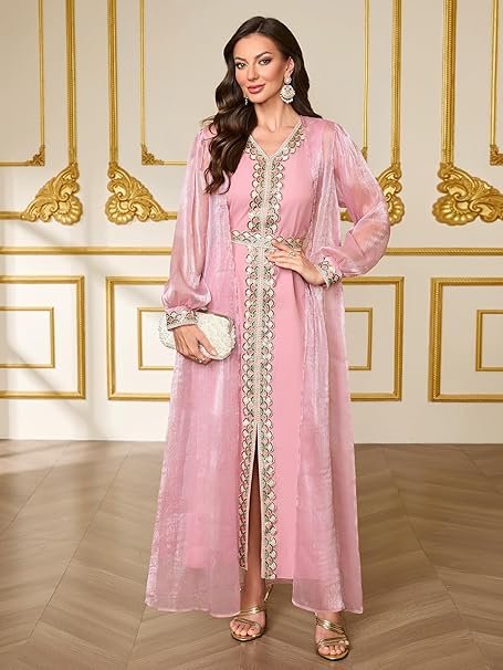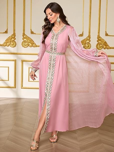 مغربي انيق، باكمام طويلة ورداء بلون بينك، عباية بطول الارض للنساء