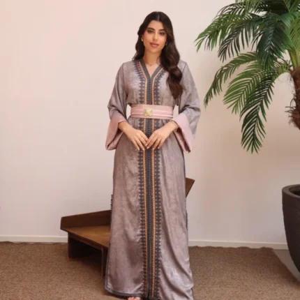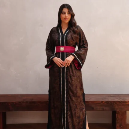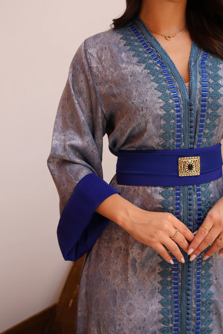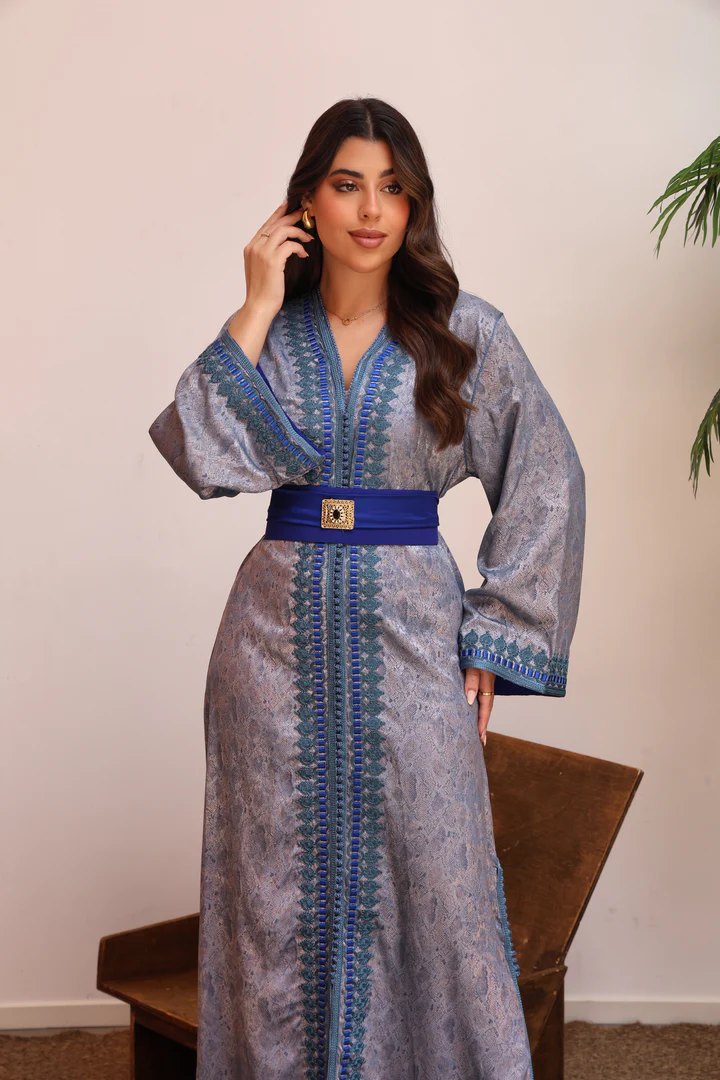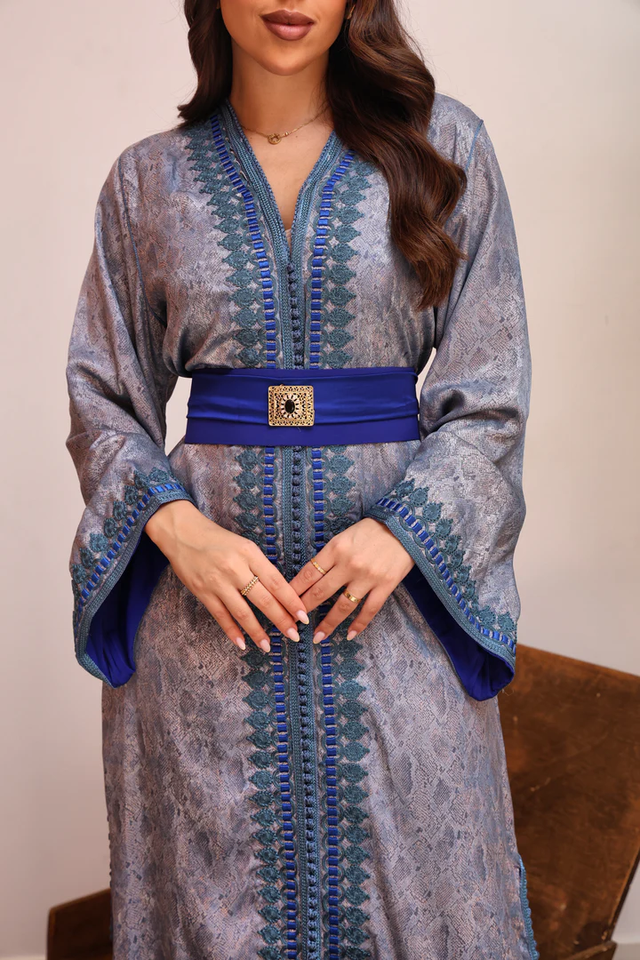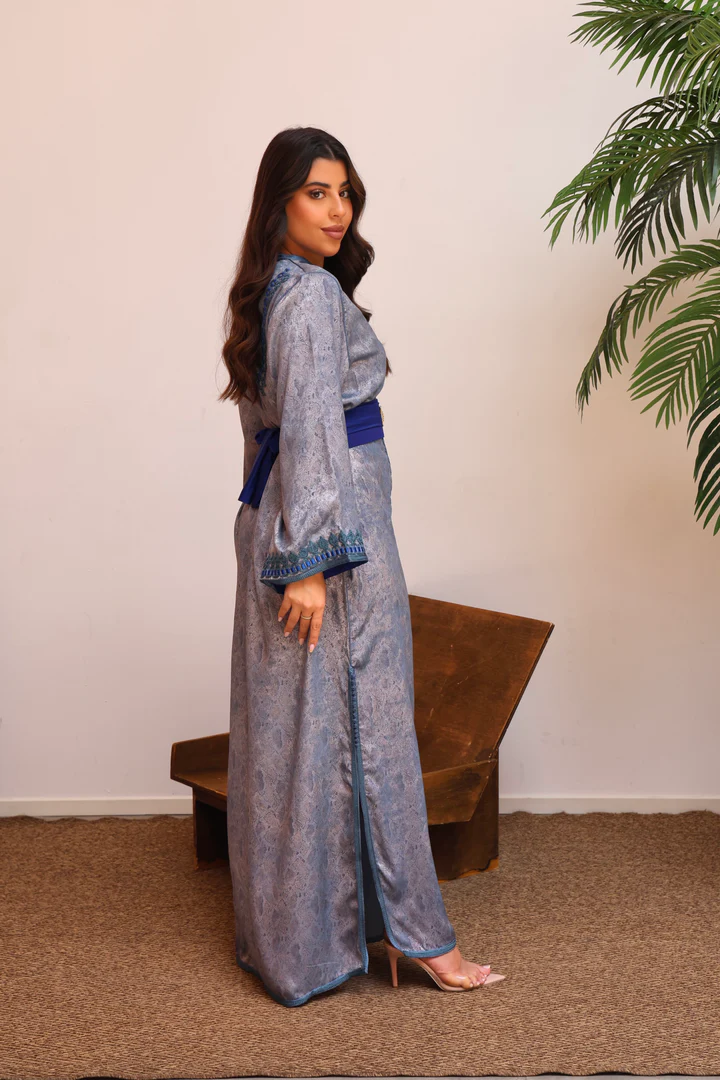 قفطان مغربي فاخر بقماش لامع بنقشة راقية، مزدان بتطريز طولي باللون الأزرق وحزام عريض بتفاصيل ذهبية يبرز الخصر ويمنحك إطلالة أنيقة للمناسبات الخاصة.