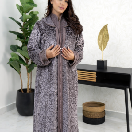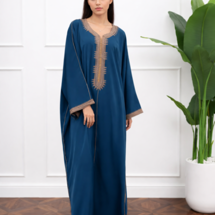 تألقي بإطلالة تجمع بين الأصالة والفخامة مع هذا القفطان المغربي الفاخر المصنوع من قماش لامع بنقشة أنيقة تعكس الذوق الراقي. يتميّز بتطريز طولي متقن بدرجات الأزرق يزيّن التصميم بالكامل ويمنحه لمسة حيوية وعصرية مستوحاة من التراث المغربي.
