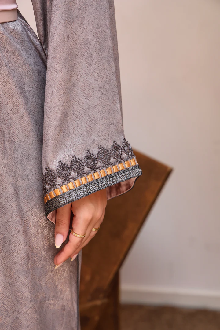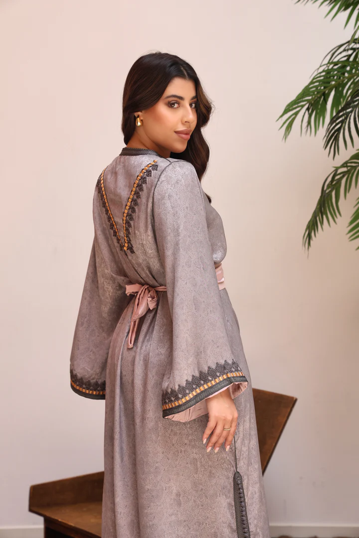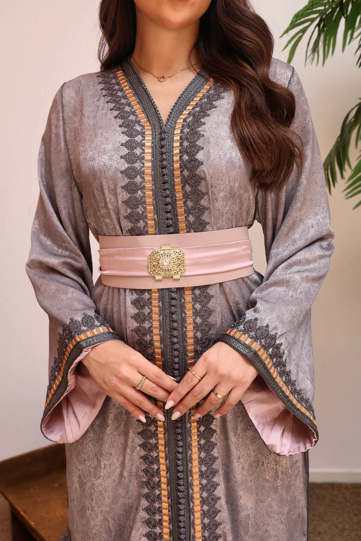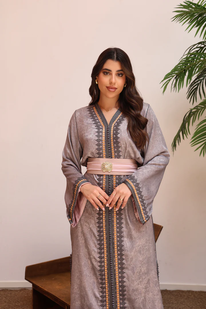 يأتي القفطان مزوّداً بحزام عريض بتفاصيل ذهبية فاخرة يعزز من جمال الخصر ويضفي لمسة ملكية على الإطلالة، مما يجعله خياراً مثالياً للمناسبات الخاصة والسهرات الراقية.