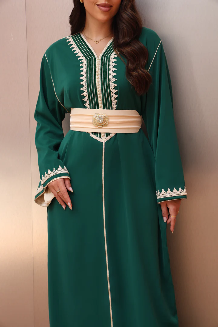 تميّزي بإطلالة راقية مع هذا القفطان المغربي الفاخر المصمم بعناية ليجسد جمال التراث بروح عصرية أنيقة. تم تصنيع القفطان من قماش الكريب الناعم الذي يمنحك راحة مثالية وانسيابية جذابة، ليكون خياراً مثالياً لمختلف المناسبات.