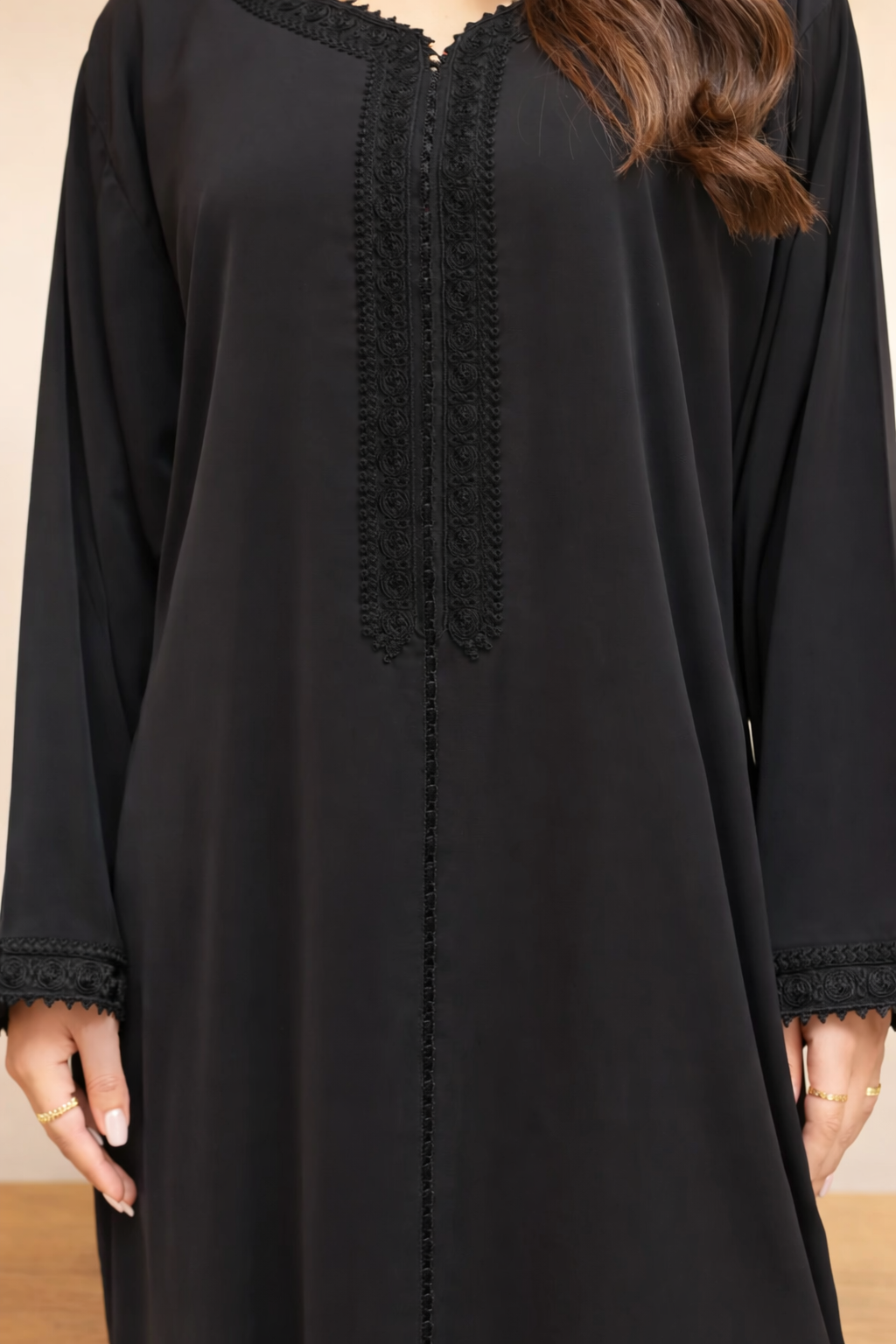 قفطان مغربي من قماش الكريب الفاخر بتطريز خفيف على الجزء العلوي، يجمع بين الراحة والأناقة بأسلوب راقٍ يناسب مختلف الأذواق والمناسبات.