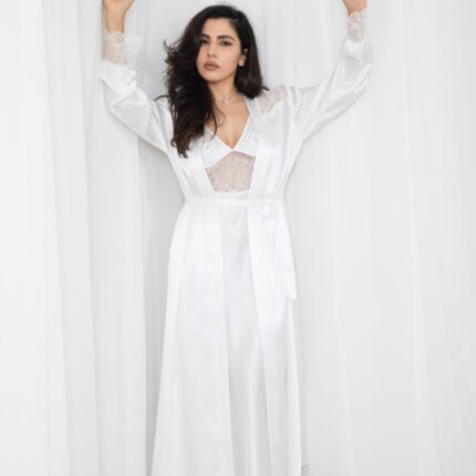 طقم روب وقميص نوم ساتان طويل – أبيض (2 قطعة)