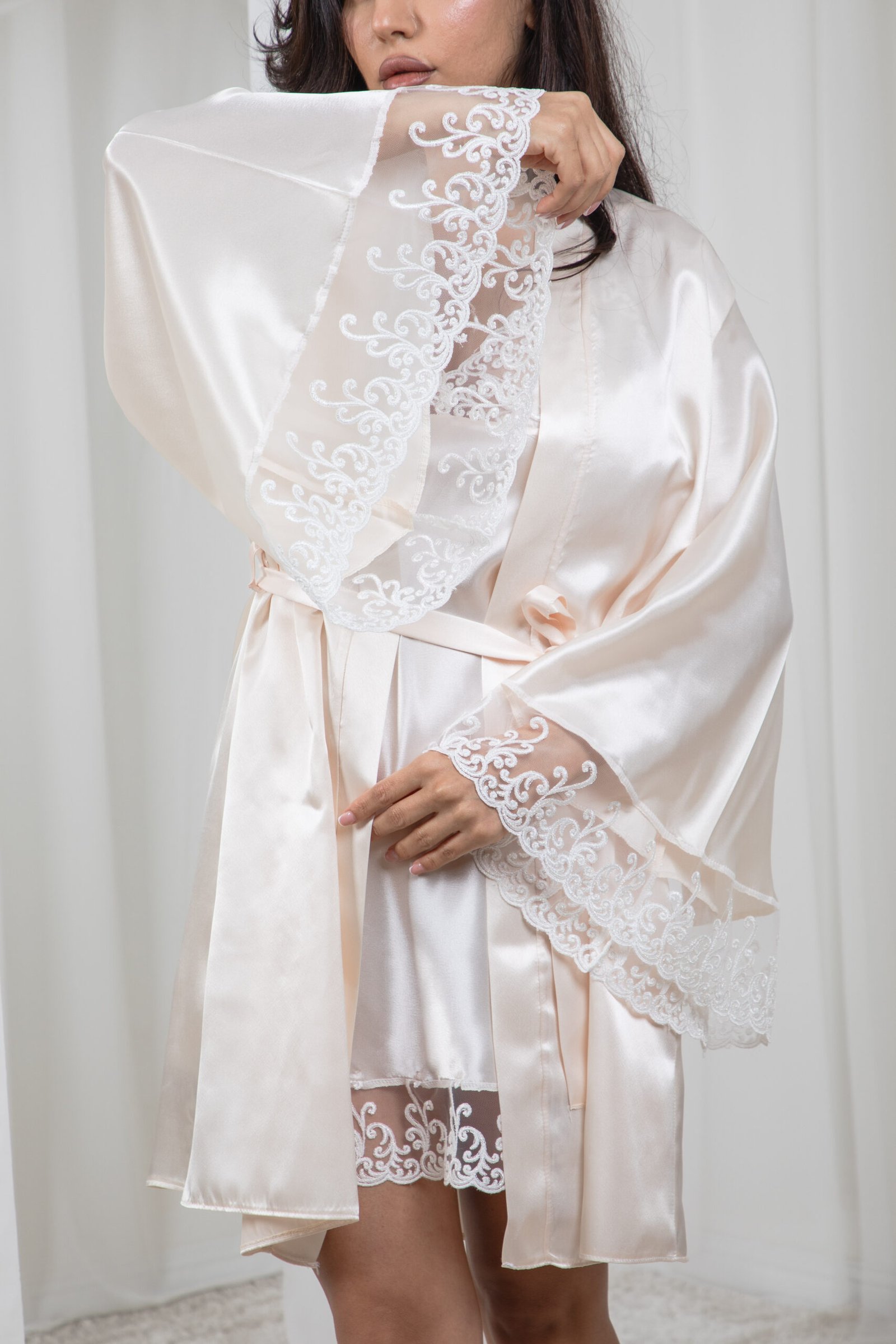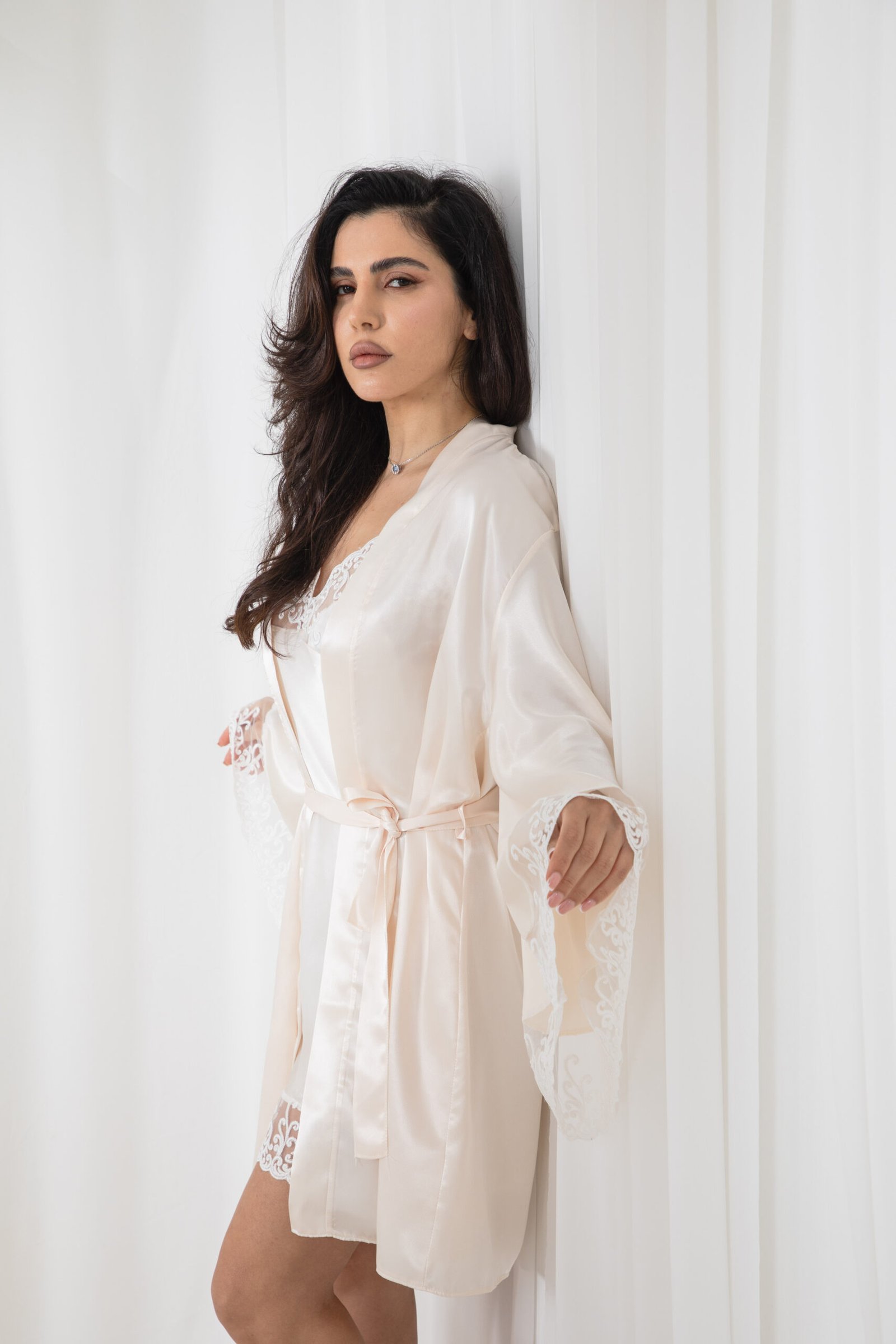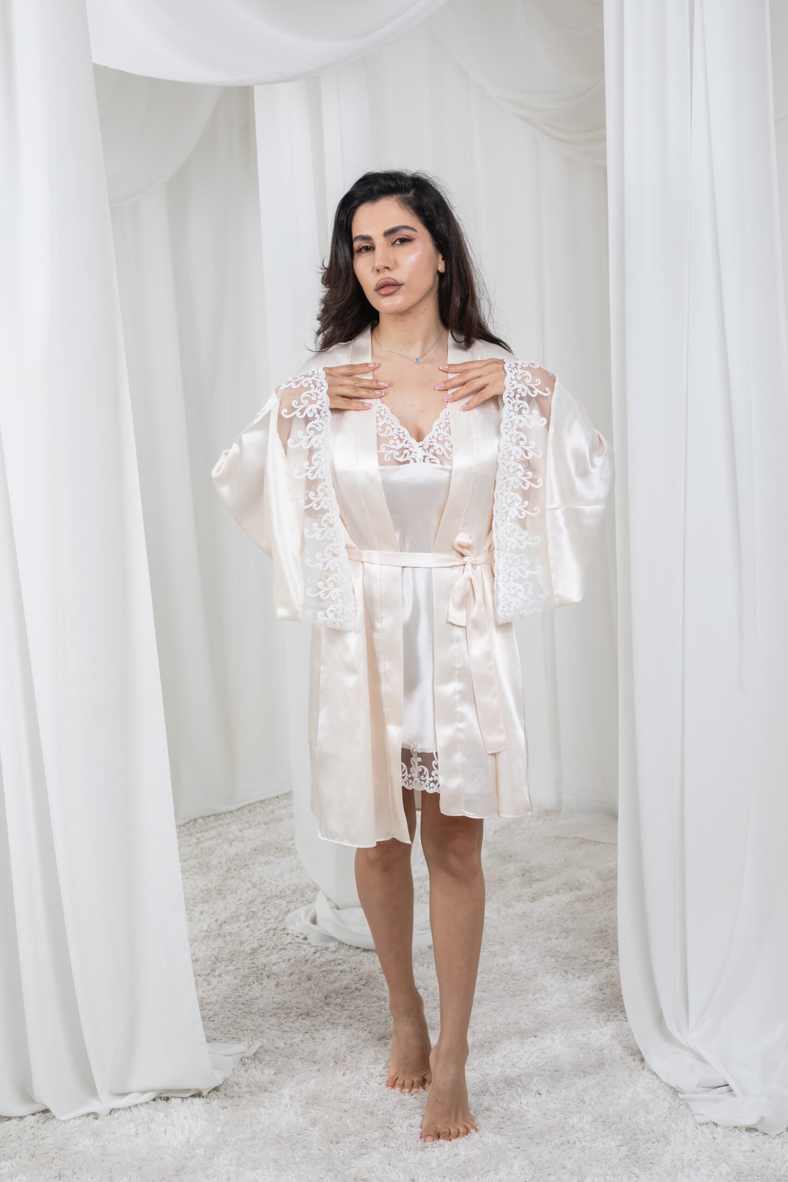 طقم مكون من قطعتين (روب خارجي وقميص نوم) مصنوع من الساتان الفاخر عالي الجودة بلمعة هادئة وتصميم مزين بالدانتيل الراقي على الأكمام، ليمنحكِ إطلالة أنثوية مريحة وأنيقة في آن واحد. - الخامة: 100٪ بوليستر