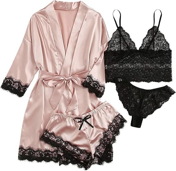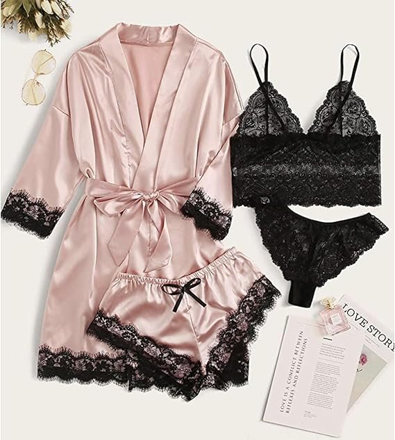 - المزايا: طقم ملابس نوم مكون من 4 قطع، يتضمن طقم ملابس داخلية من الدانتيل، رداء ليلي من الساتان مع حزام، وشورت للنوم. طقم بيجامة مريح للاسترخاء ليلًا أو نهارًا. حزام الرقبة على شكل حرف V المثير قابل للتعديل.