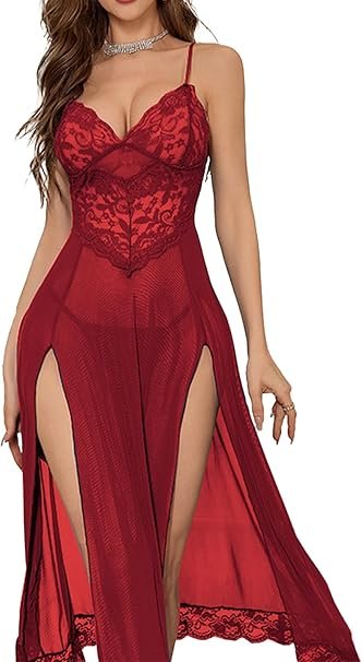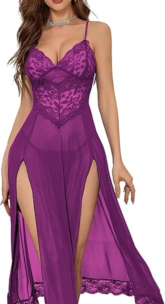 - قمصان نوم ساحرة: يتميز هذا الفستان الليلي المثير بقبة V عميقة تتسابق مع القلب مما يبرز صدرك الحسي والآسر. يُظهر التصميم ذو الفتحة الجانبية العالية للحاشية ساقيك النحيلة والجذابة، مما يخلق إحساسًا لا يقاوم بالغموض والإثارة.