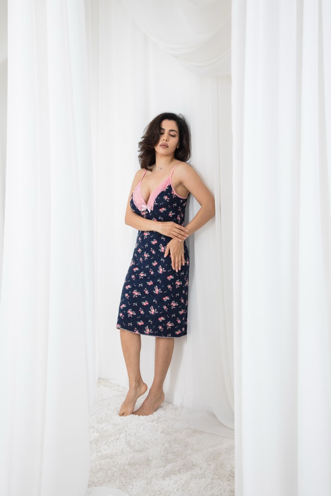 ضيفي لمسة من الرقة والرفاهية للياليكِ مع هذا التصميم الساحر. بين اللون الكحلي الكلاسيكي المزين بنقشات الزهور الصغيرة وتفاصيل الدانتيل الوردي الجذاب، ليمنحكِ إطلالة منزلية مفعمة بالأنوثة والراحة.