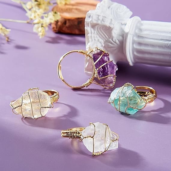 مجموعة من 4 قطع من خواتم كريستال شاكرا، خواتم كريستال للشفاء من الأحجار الكريمة، خواتم قابلة للتعديل بنمط غير منتظم ملفوفة بسلك كريستال، مجوهرات للنساء والبنات