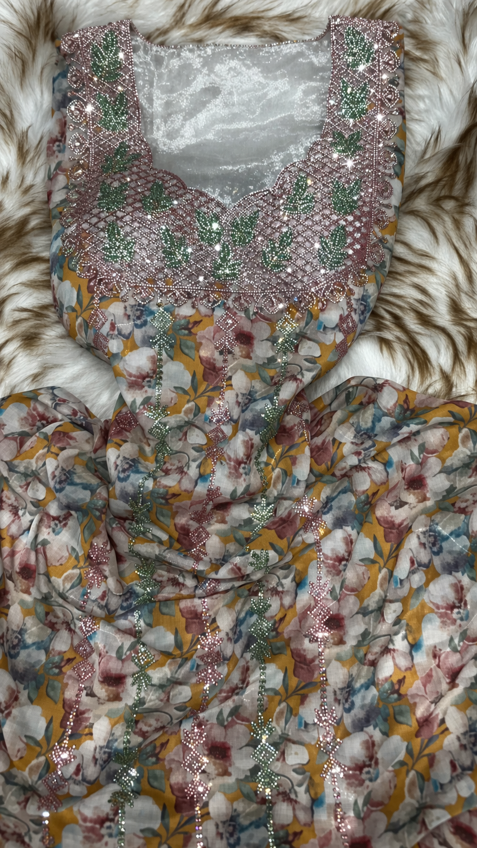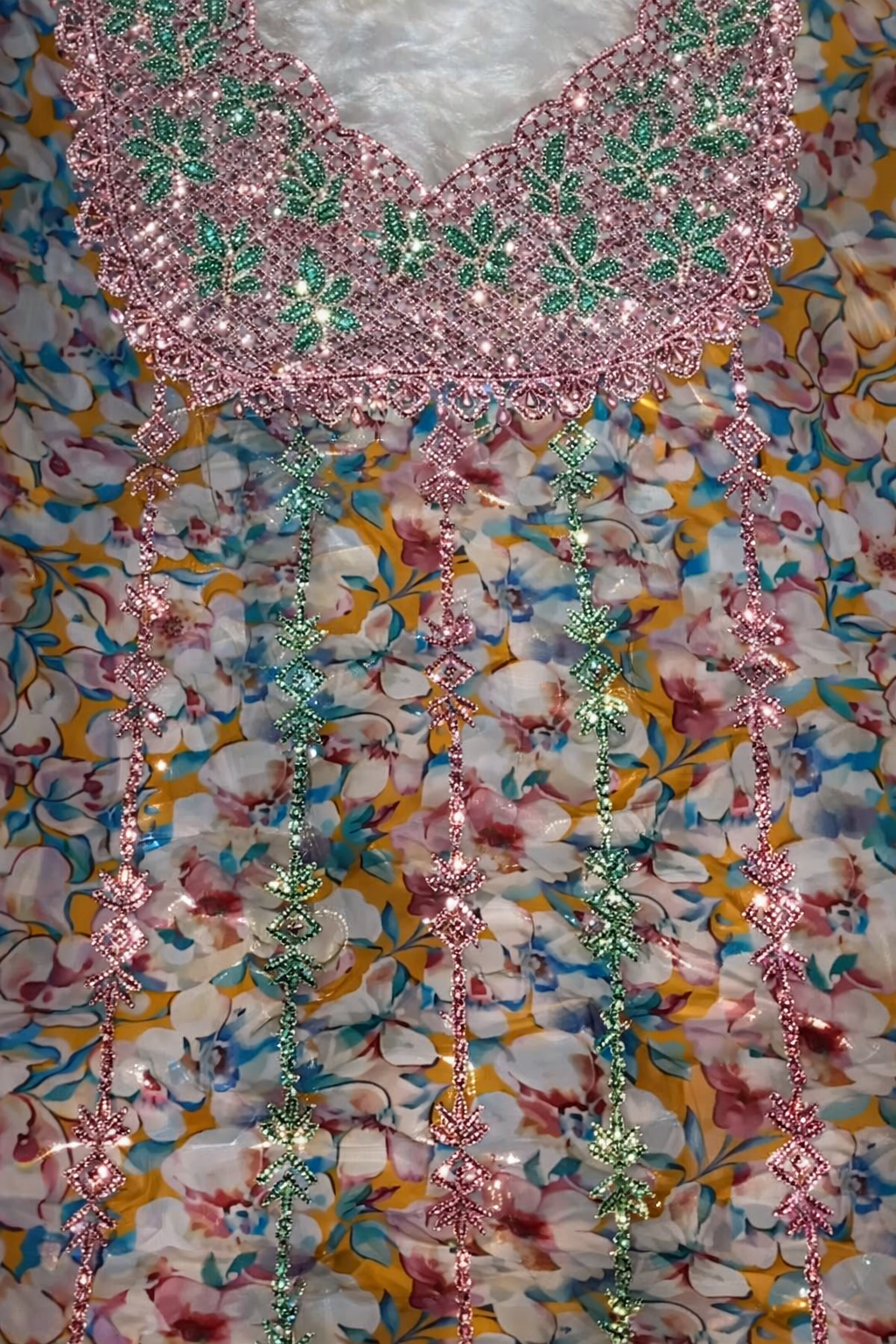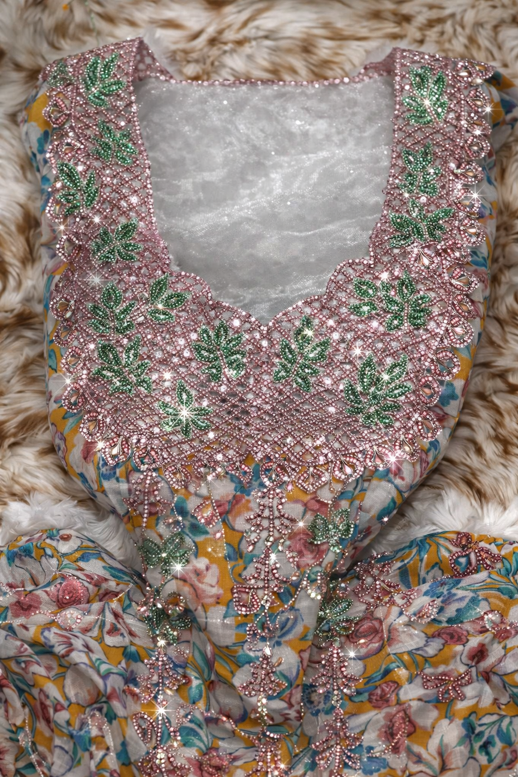 قطعة مخور أنيقة من حرير هندي فاخر، مزينة بتطريز دقيق وشغل سلاسل ناعم يمتد بانسيابية، مع لمسات كريستال تضيف بريقاً راقياً.
