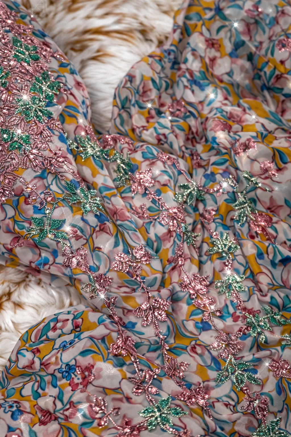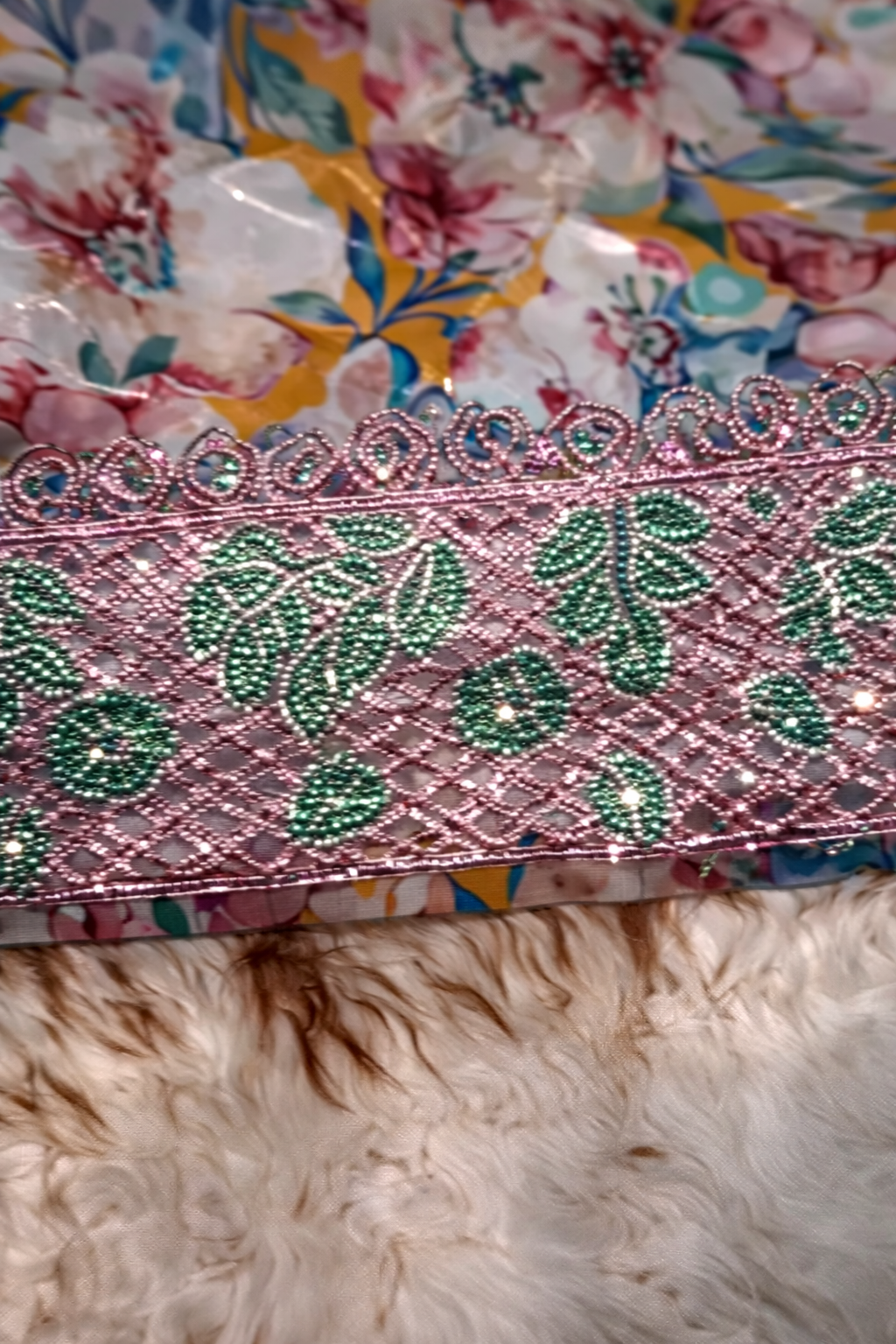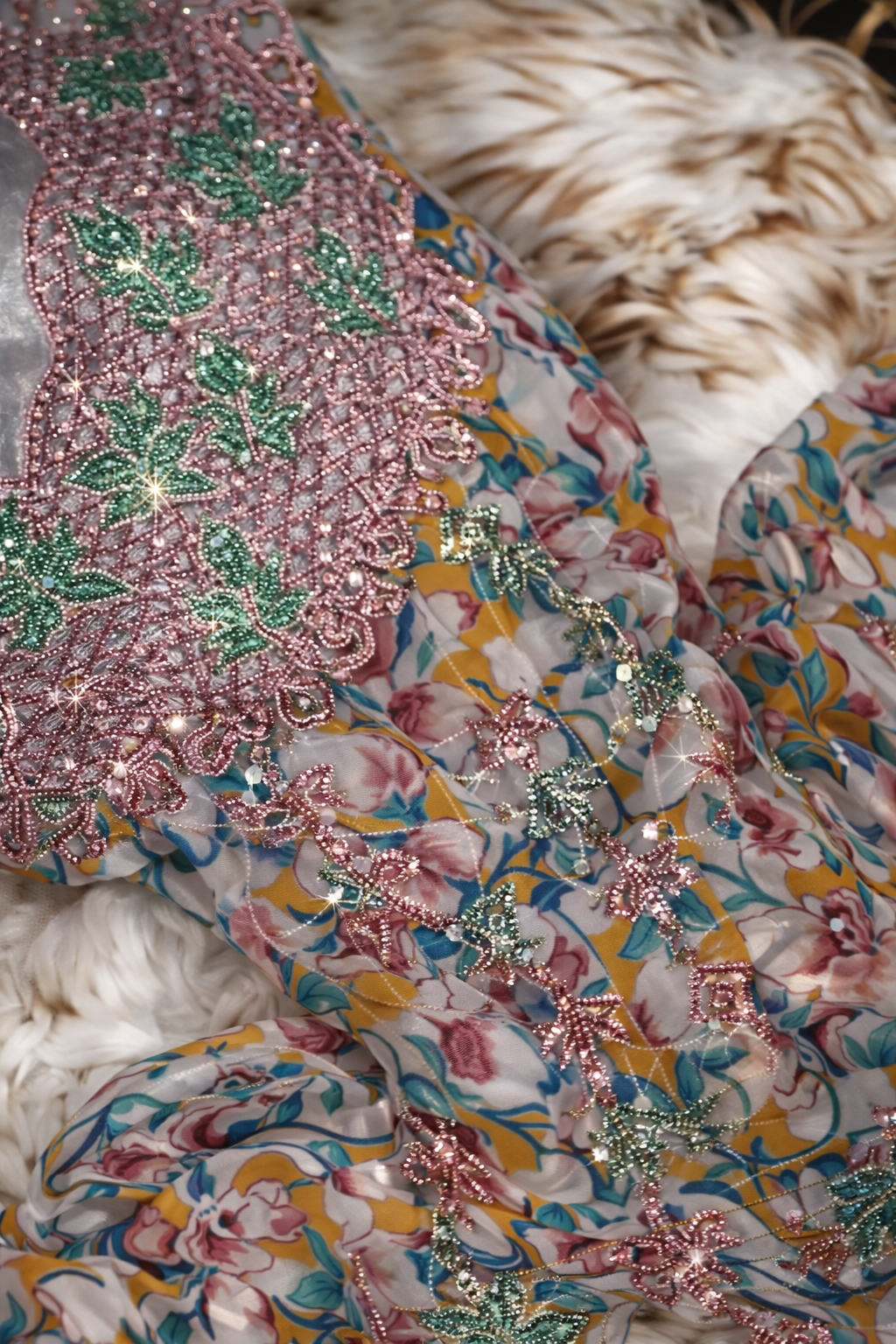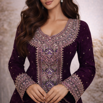قطعة مخور أنيقة من حرير هندي فاخر، مزينة بتطريز دقيق وشغل سلاسل ناعم يمتد بانسيابية، مع لمسات كريستال تضيف بريقاً راقياً.