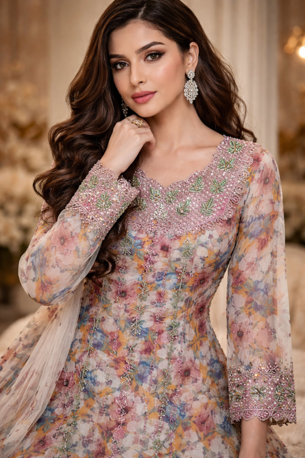 استمتعي بإطلالة فاخرة مع هذا المخور المصنوع من حرير هندي عالي الجودة، حيث يلتقي التصميم العربي الأنيق مع تفاصيل التطريز اليدوي المتقن. يتميز بشغل سلاسل ممتد بانسيابية نحو الأسفل، يمنح القطعة حركة وجاذبية لافتة، بينما تضيف لمسات الكريستال بريقاً أنثوياً راقياً يعكس الفخامة في كل زاوية. مثالي للمناسبات والسهرات، ليمنحك حضوراً مميزاً يجمع بين الرقي والنعومة في آن واحد.
