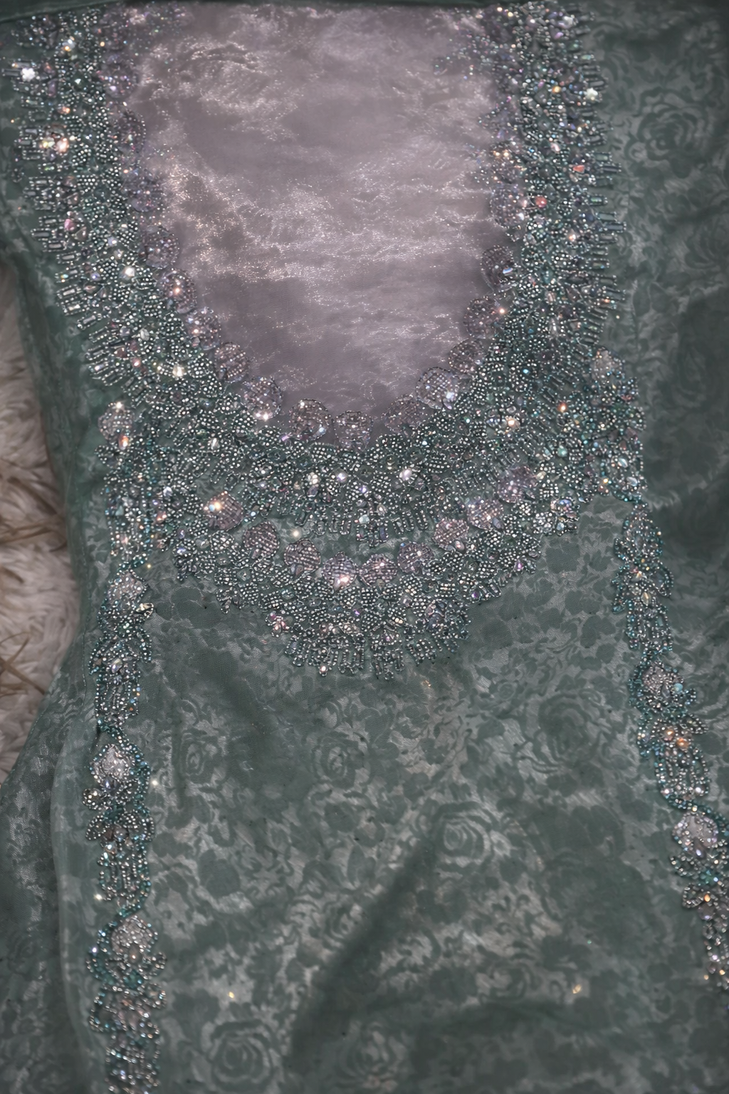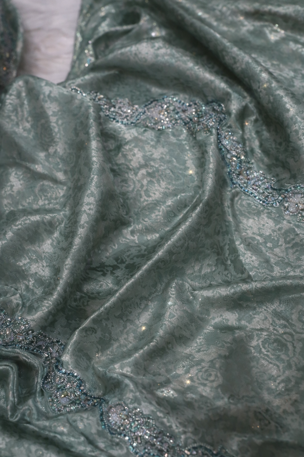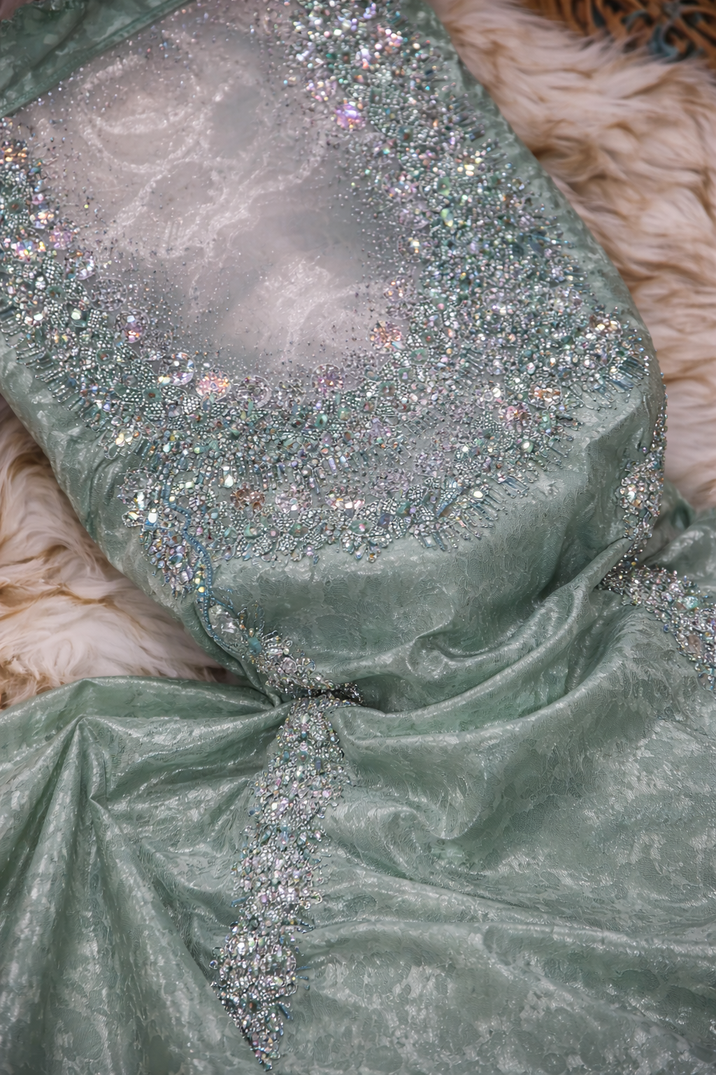 استمتعي بإطلالة فاخرة مع هذا المخور المصمم من حرير جاكرد طايح شغل تطريز وكريستال وفصوص سته، حيث يجمع بين نعومة القماش وانسيابيته مع تفاصيل تطريز غنية تعكس الذوق الراقي والفخامة.