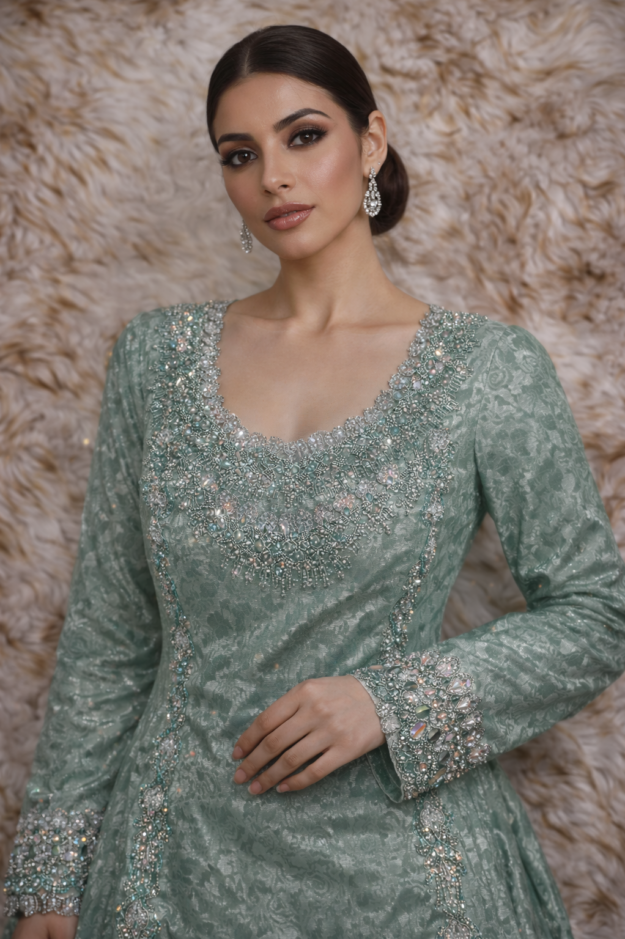 يتميز التصميم بزخارف متقنة مزينة بالكريستال والفصوص اللامعة التي تضيف بريقًا جذابًا، مع تناغم جميل في الألوان يمنحك حضورًا أنثويًا مميزًا في كل مناسبة. كما أن الأكمام الطويلة المزينة بنفس تفاصيل التطريز تعطي توازنًا أنيقًا وإطلالة متكاملة.